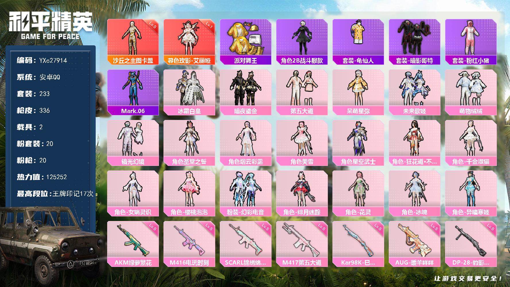 安卓Q-2红装3稀有2载具20粉装18特效枪11热门233套装336枪皮 17印记 历史绝世王牌22星