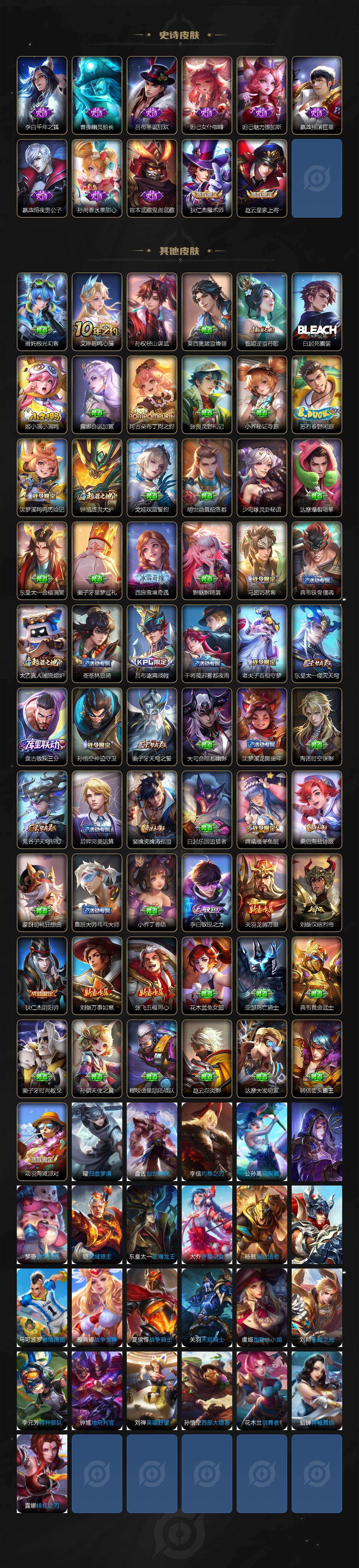 【传说皮肤】:女娲愿照千秋盛,妲己愿照众生和,澜愿照九州拓,虞姬愿照岁时盈,云缨幻光神枪,桑启鸣野蒿,李白诗剑行,铠绛天战甲,达摩黄金狮子座,花木兰冠军飞将,梦奇胖达荣荣