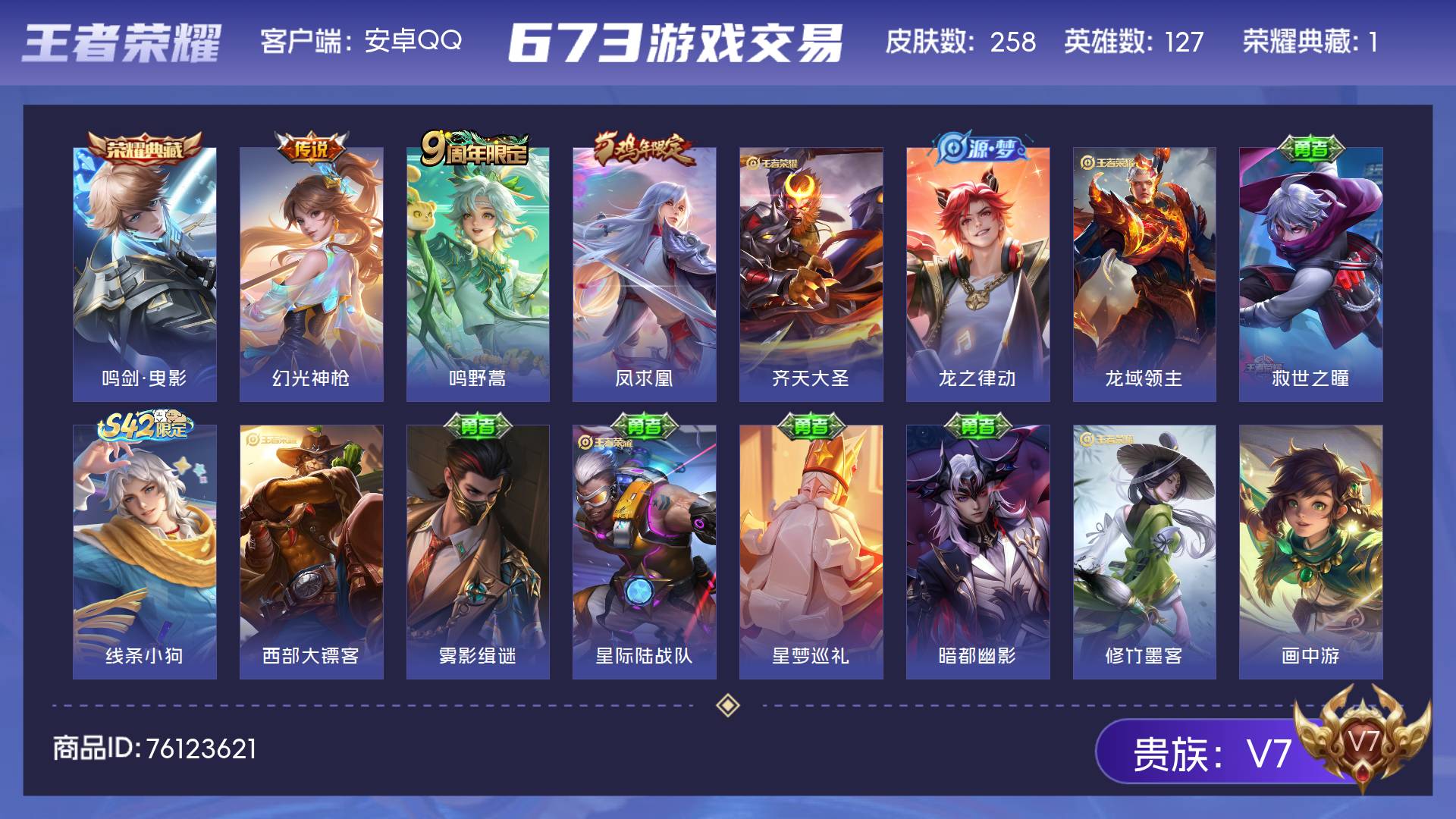 【可二次 V7 1典藏 3传说 凤求凰】安卓Q-258皮肤-127英雄 【典藏皮肤】 鸣剑·曳影 【传说皮肤】 鸣野蒿 幻光神枪 凤求凰 【史诗皮肤】 龙之律动 布丁狗之约 大圣娶亲 热血海滩 西部游侠 虚灵犬护 谧流熔炉 劲辣红锅 线条小狗 熊喵少女 威尼斯狂欢 雪夜绮愿 玫蓝誓约 江河有灵 苍林狼骑 完美运算 荣光圣徽 漠中幻影 顽趣 舞动绿茵 幽灵船长 繁星吟游 功夫厨神 女仆咖啡 魅力维加