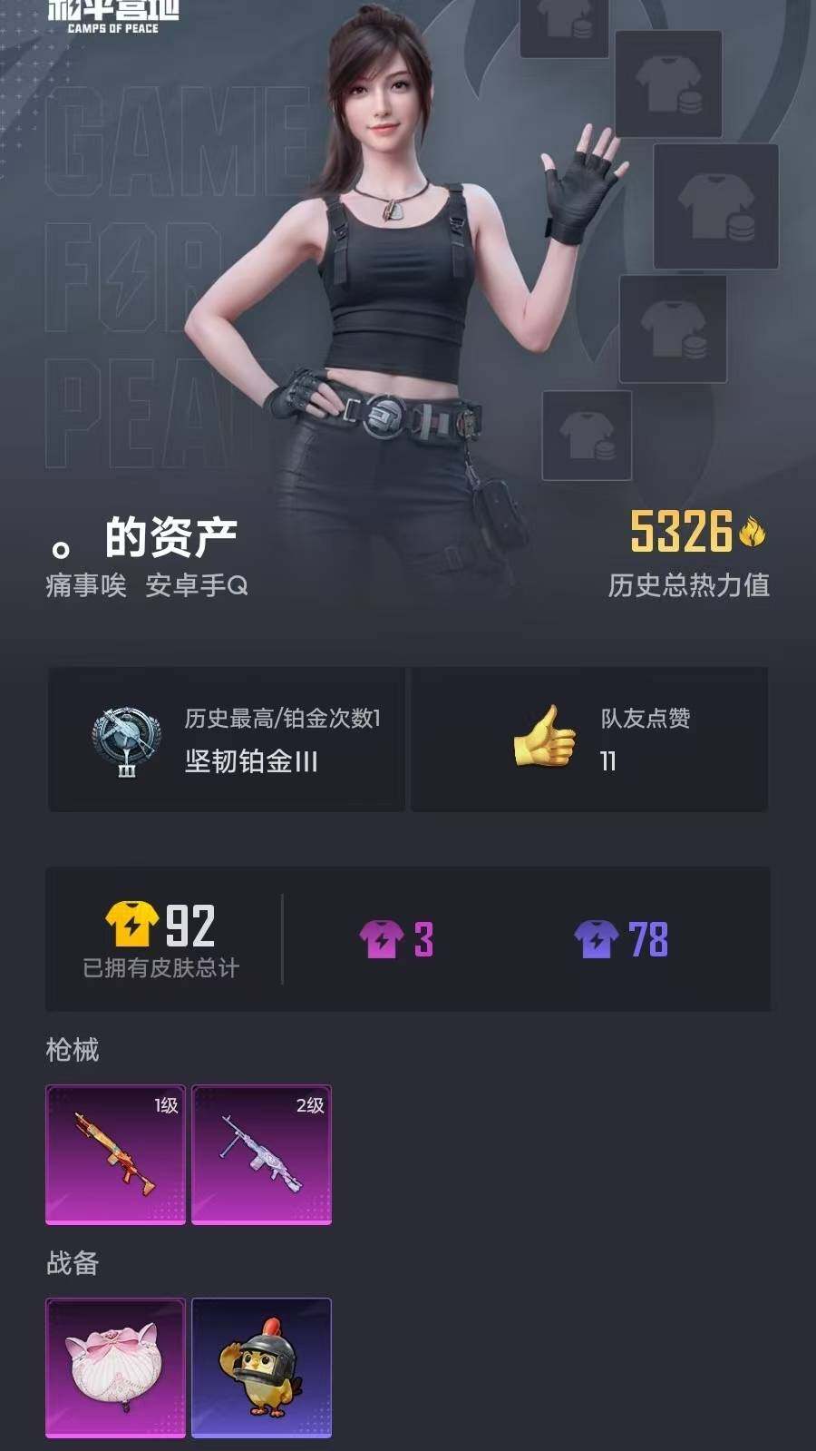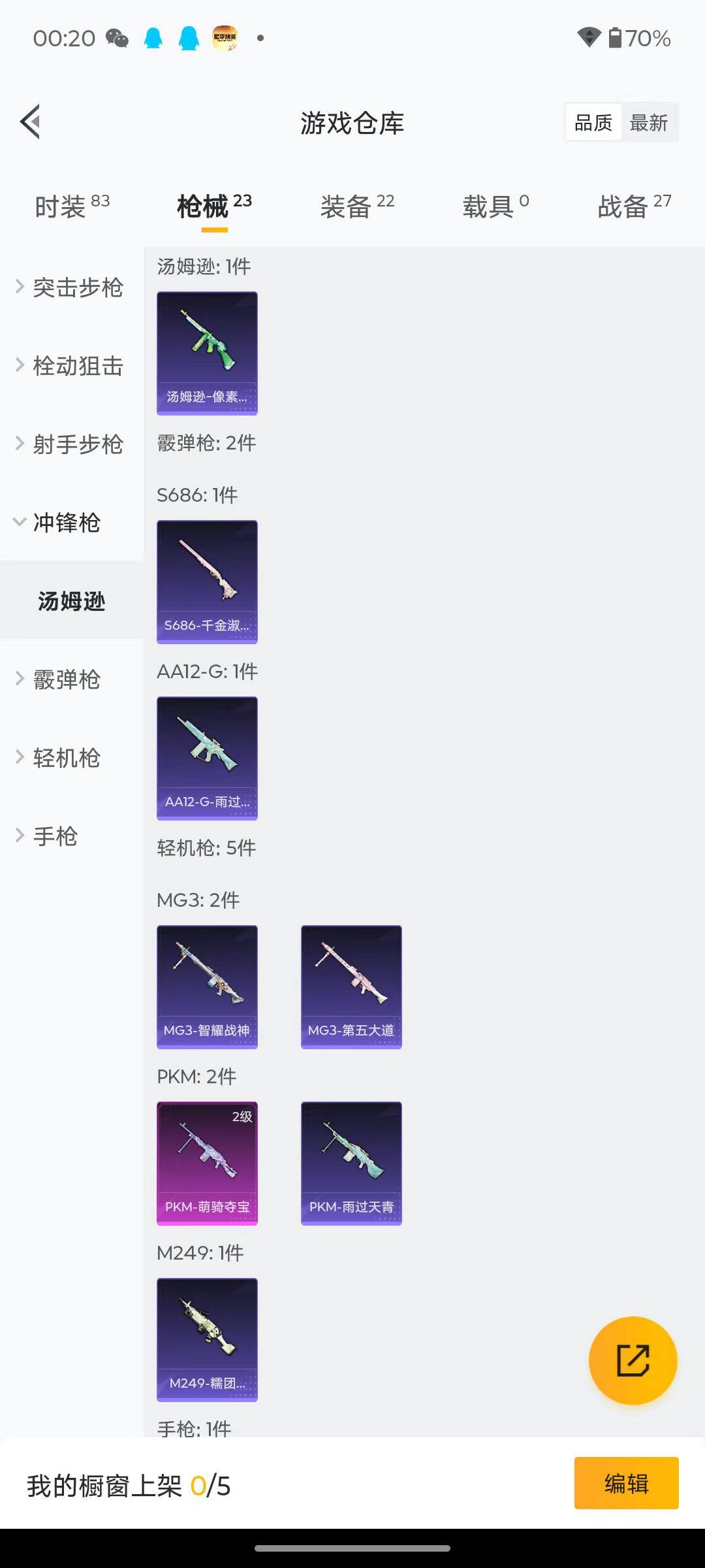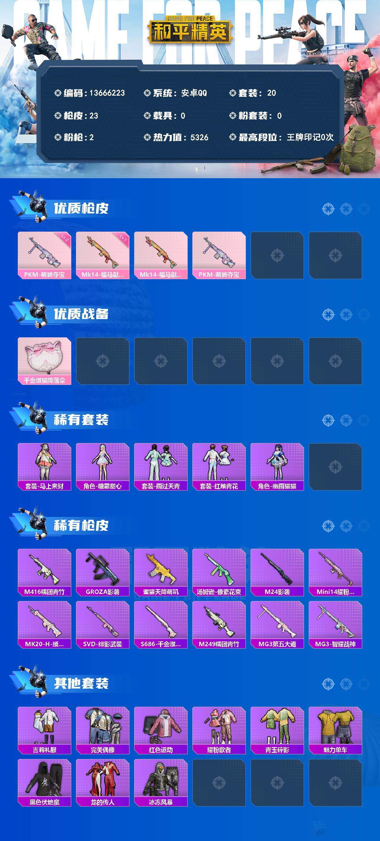 20套装/枪械2/装备22/战备27/热力值5326/一级Mk14-福马献瑞/二级PKM-萌骑夺宝/Mk14-福马献瑞/PKM-萌骑夺宝/千金淑猫降落伞/套装-马上来财/角色-糖霜甜心/套装-雨过天青/套装-红釉青花/角色-幽雨猫猫/M416-糯团青竹/GROZA-影袭/蜜獾-天降萌叽/汤姆逊-像素花束/M24-影袭/Mini14-耀粉歌者/MK20-H-绶带小兔/SVD-绯影武装/S686-千