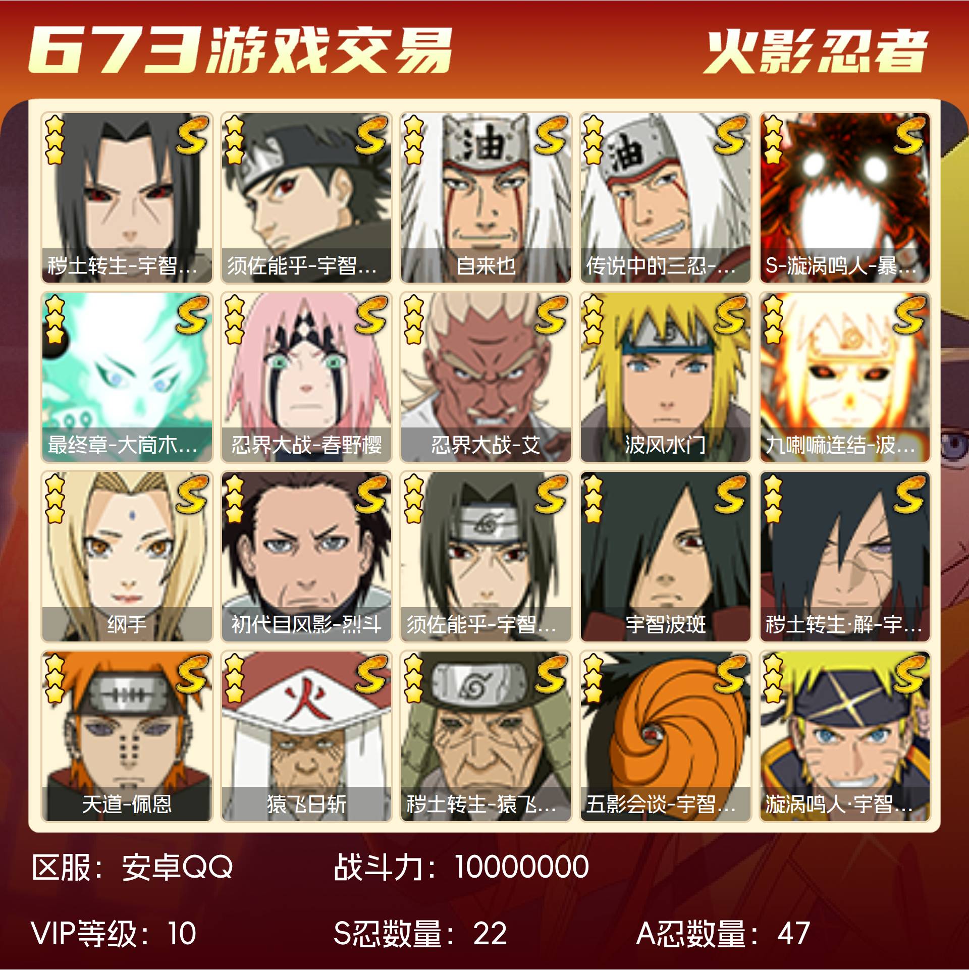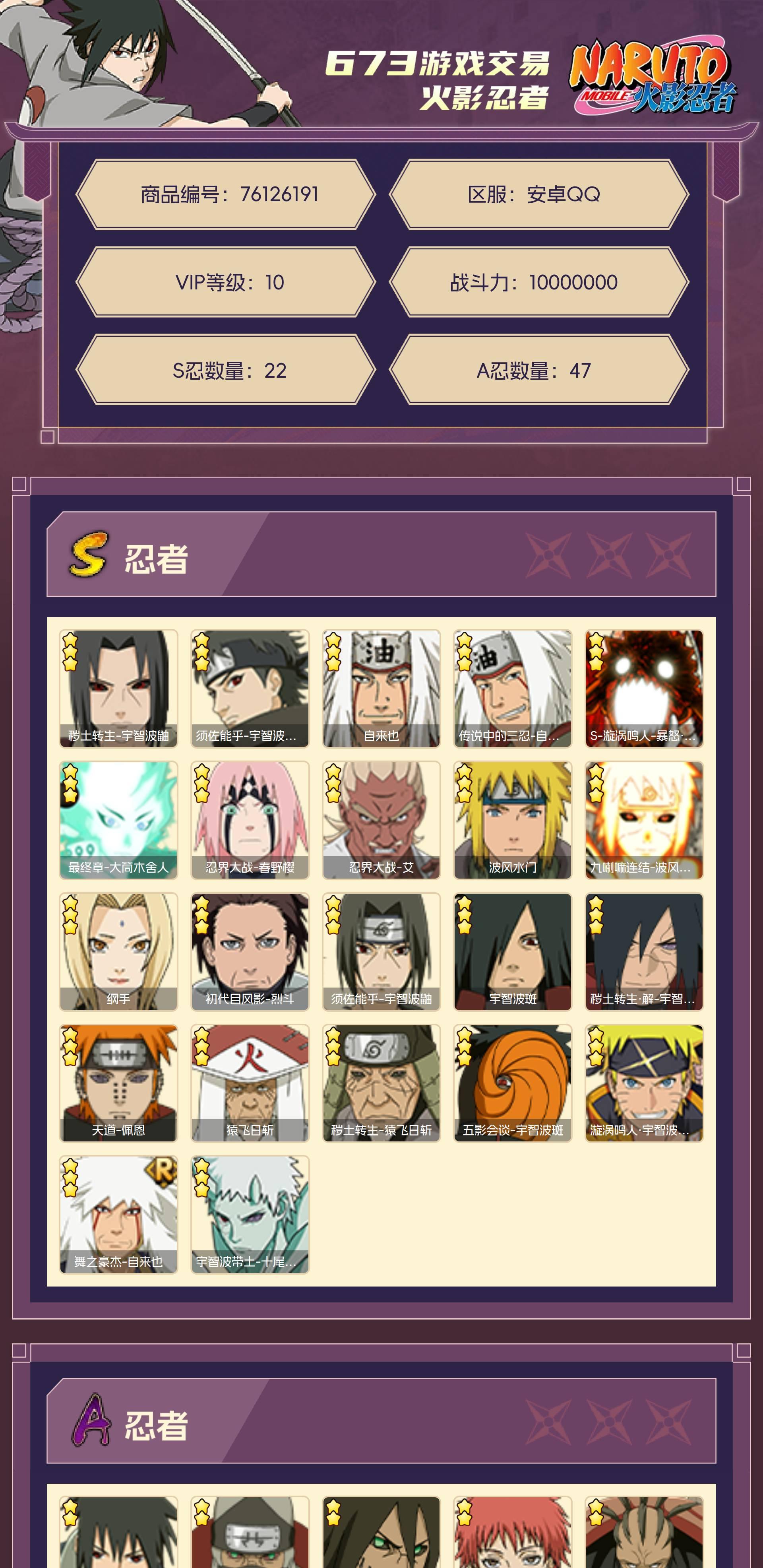 角色等级141 战斗力10000000 S忍22 A忍47 10
