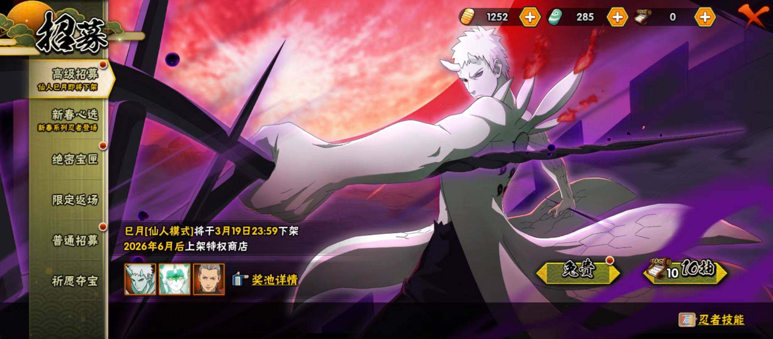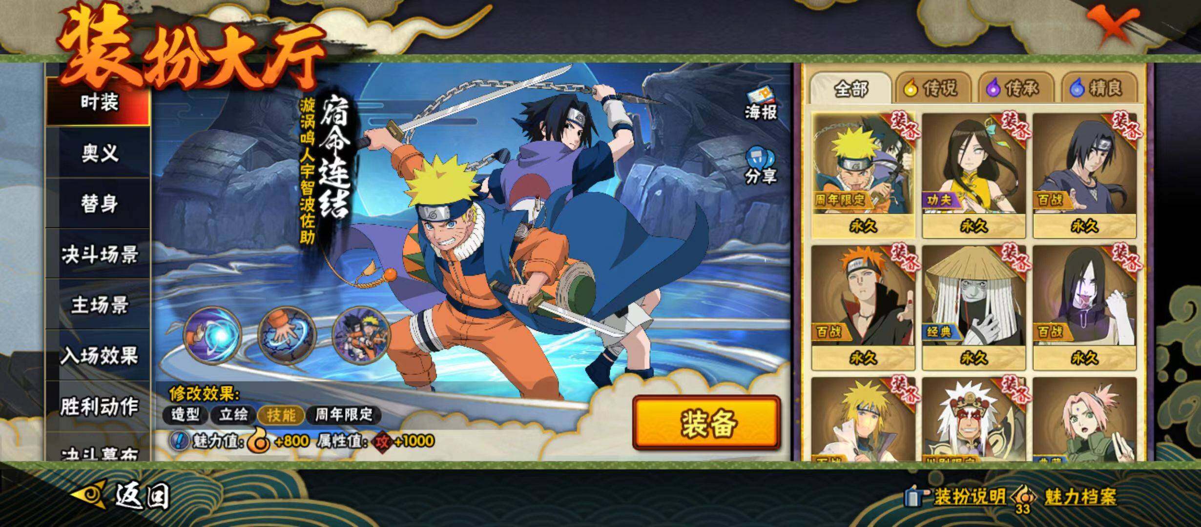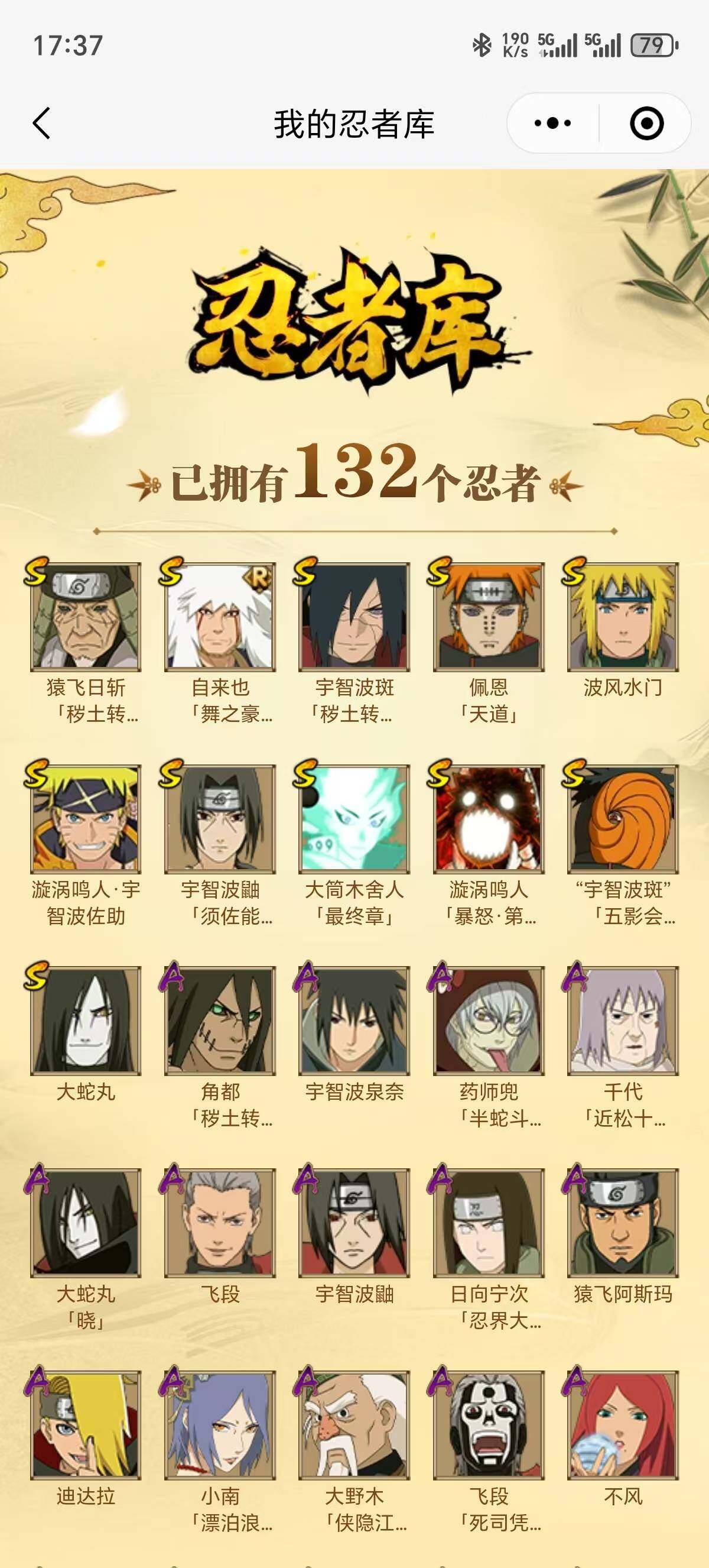 【S级忍者】:猿飞日斩「秽土转生」(3星),宇智波斑「秽土转生·解」(3星),宇智波鼬「须佐能乎」(3星),自来也「舞之豪杰」(3星),大蛇丸(3星),波风水门(3星),佩恩「天道」(3星),大筒木舍人「最终章」(3星),漩涡鸣人「暴怒·第六尾」(3星),宇智波斑「五影会谈」(3星),漩涡鸣人·宇智波佐助(3星)