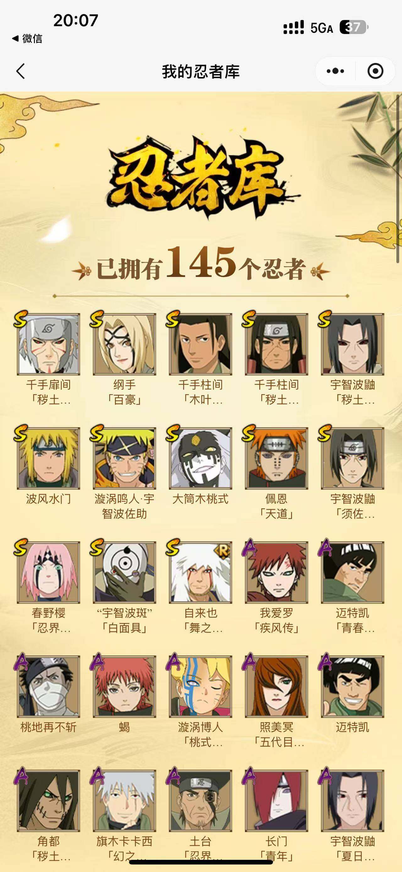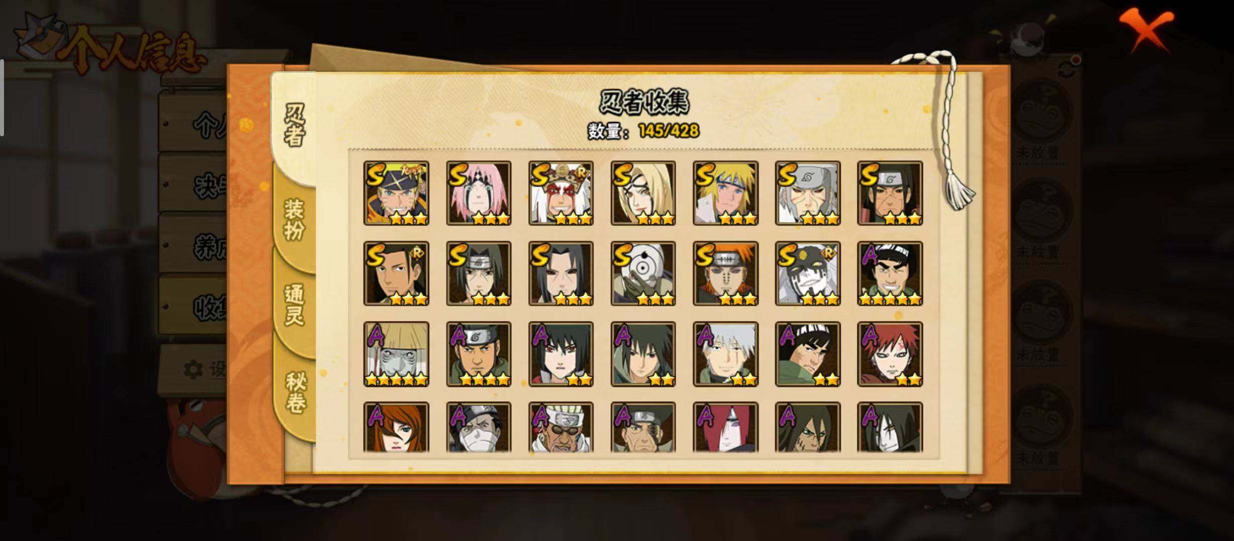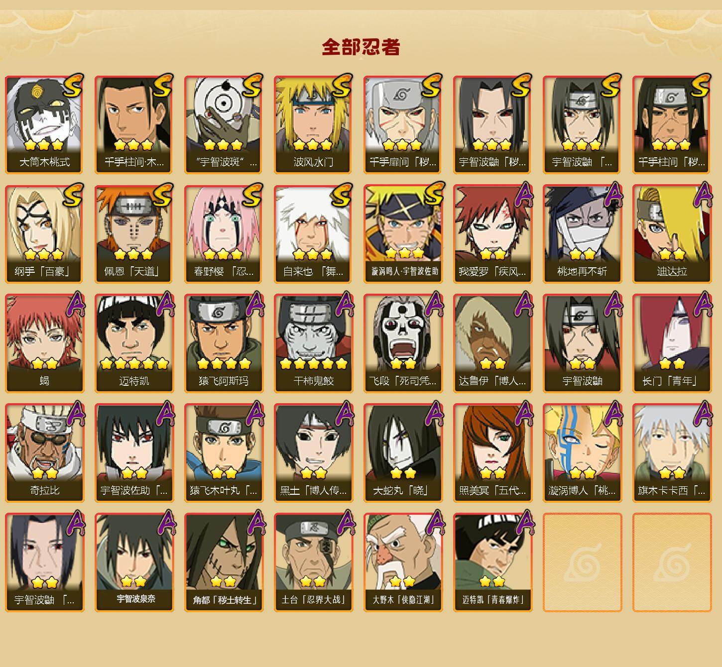 【S级忍者】:千手扉间「秽土转生」(3星),千手柱间「秽土转生」(3星),宇智波鼬「秽土转生」(3星),春野樱「忍界大战」(3星),宇智波鼬「须佐能乎」(3星),千手柱间「木叶创立」(3星),自来也「舞之豪杰」(3星),纲手「百豪」(3星),波风水门(3星),佩恩「天道」(3星),宇智波斑 「白面具」(3星宇智波斑「白面具」),大筒木桃式(3星),漩涡鸣