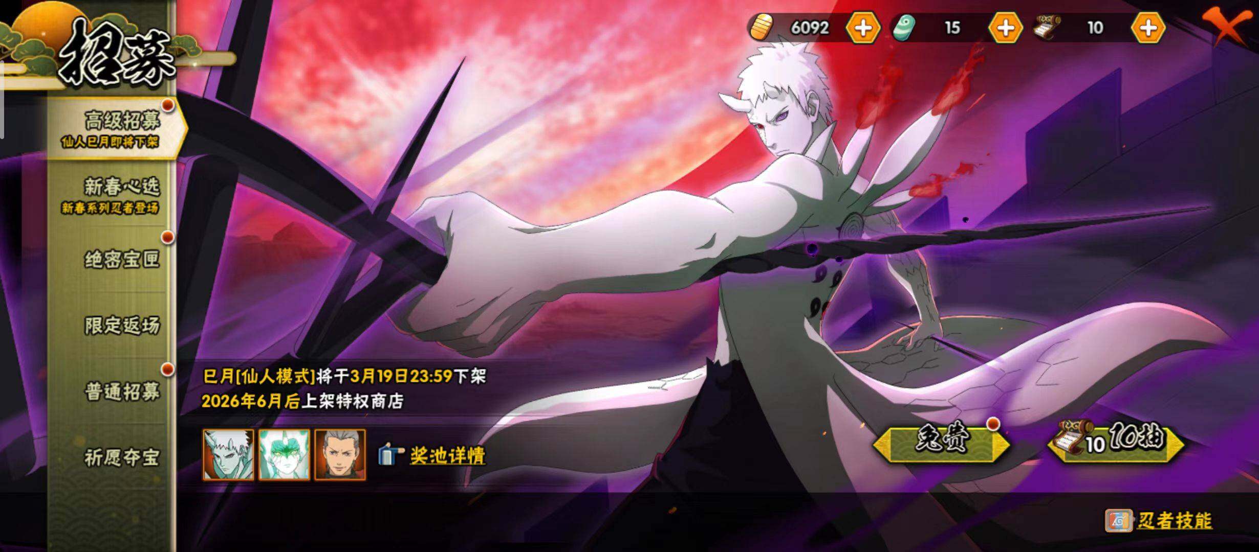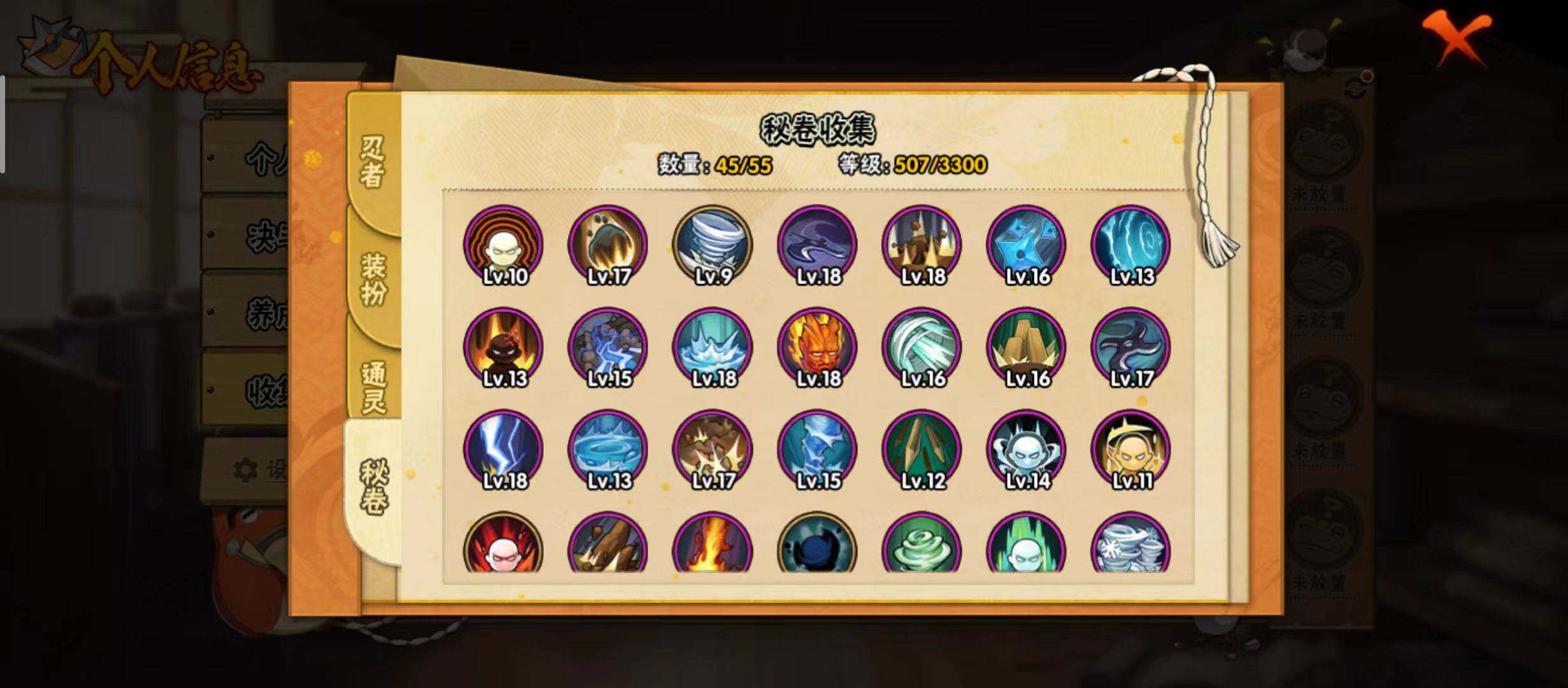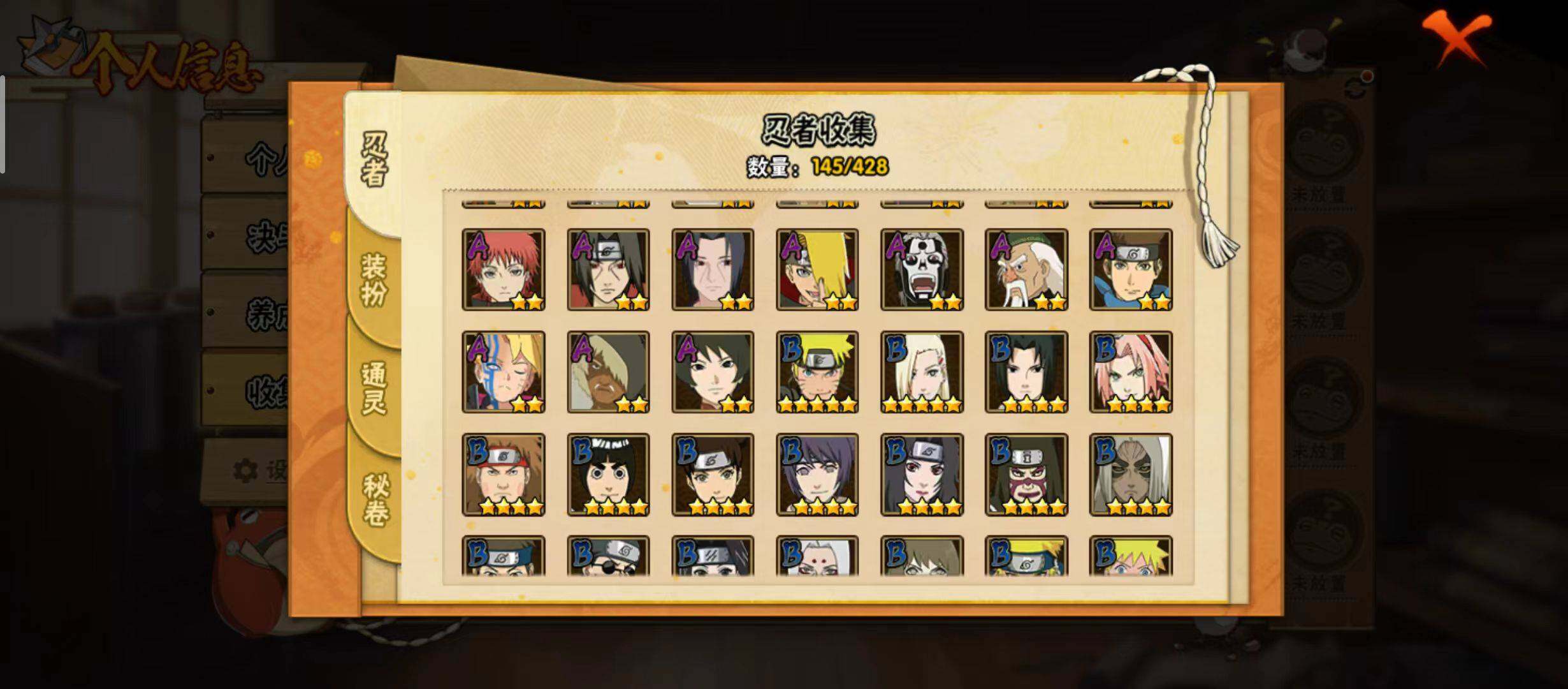 【S级忍者】:千手扉间「秽土转生」(3星),千手柱间「秽土转生」(3星),宇智波鼬「秽土转生」(3星),春野樱「忍界大战」(3星),宇智波鼬「须佐能乎」(3星),千手柱间「木叶创立」(3星),自来也「舞之豪杰」(3星),纲手「百豪」(3星),波风水门(3星),佩恩「天道」(3星),宇智波斑 「白面具」(3星宇智波斑「白面具」),大筒木桃式(3星),漩涡鸣