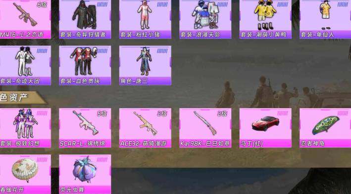 【粉色枪皮等级】:SCAR-L-锦绣绵绵(五级),M416-心之恋语(六级),ACE32-萌骑漫游(二级),Kar98K-巳巳如意(二级)