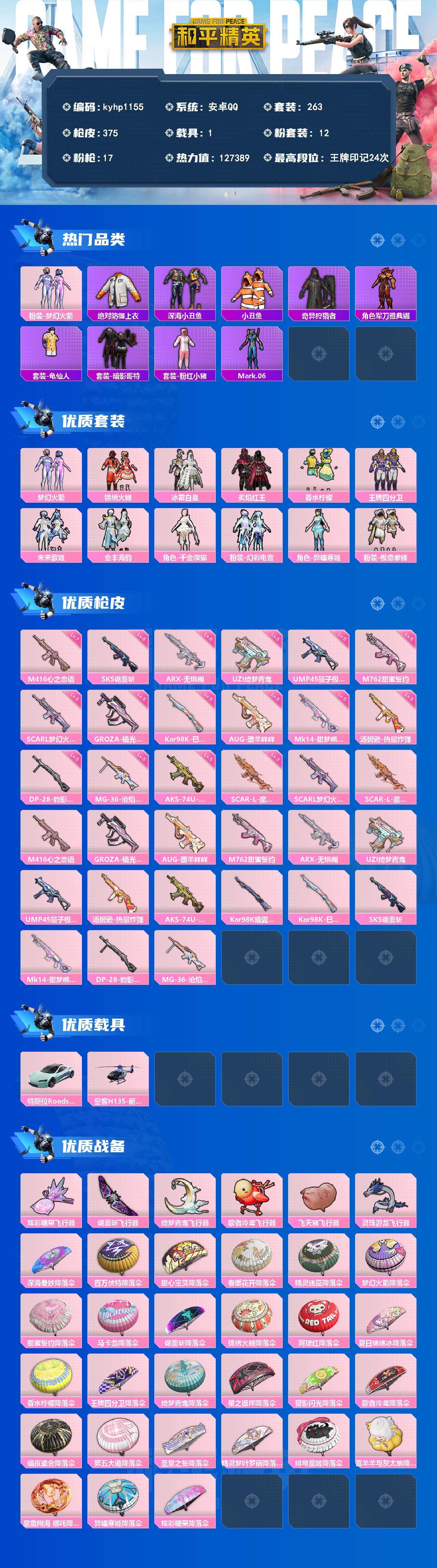 安卓 手Q-12粉装-17特效枪-1载具-6粉色飞行器-127389热力值-24王牌印记-263套装-375枪皮