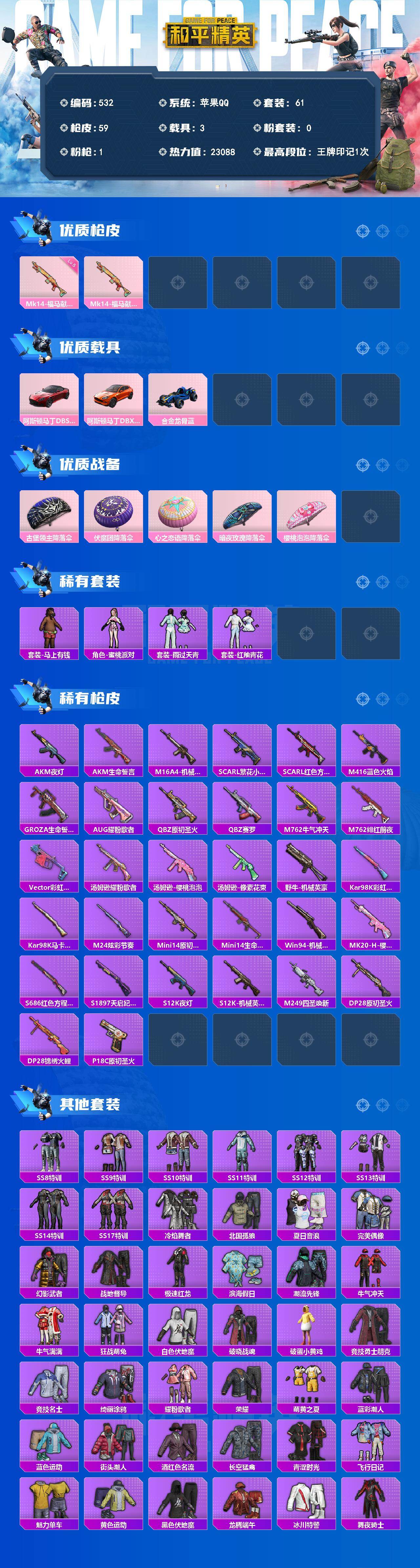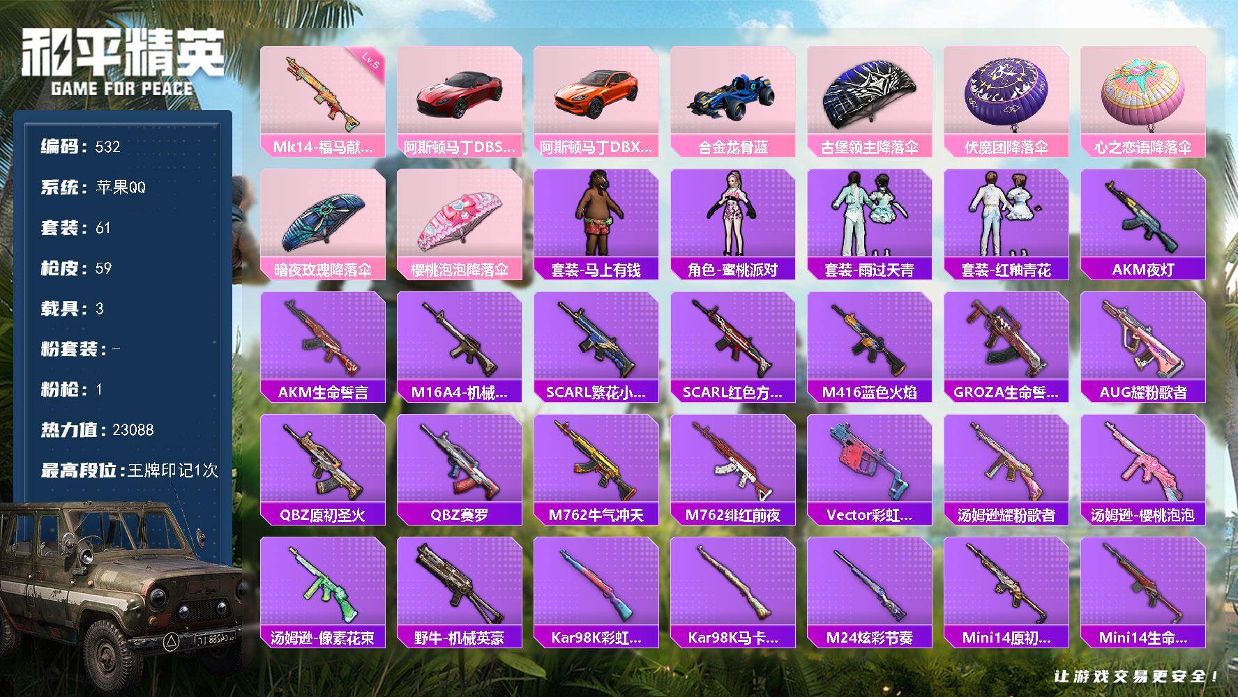 苹果 手Q-0粉装-1特效枪-3载具-0粉色飞行器-23088热力值-1王牌印记-61套装-59枪皮