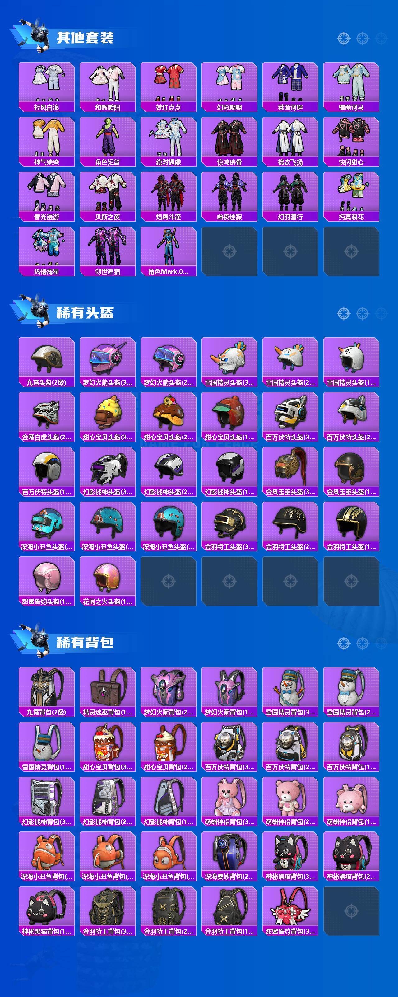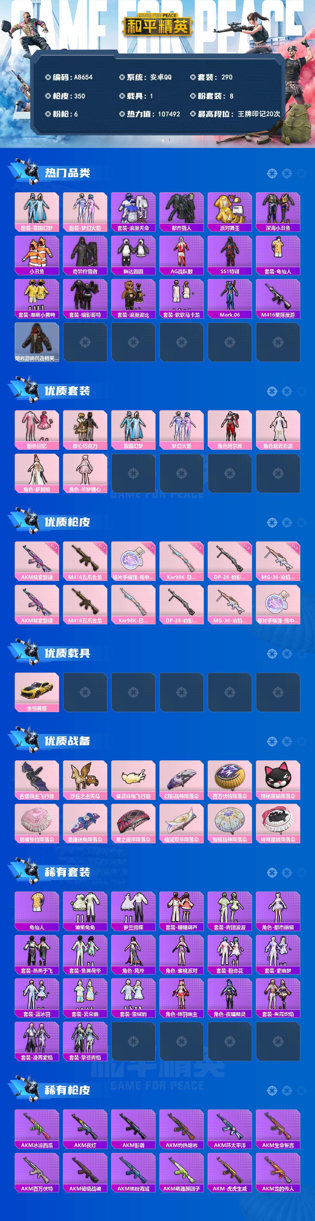 安卓【素材号 M416-五爪金龙(七级)/粉装-雪国幻梦/粉装-梦幻火箭/套装-都市猎人/套装-派对舞王/套装-暗影哥特/蓝螳螂/M416-星际漫游/粉装-甜心巧克力/角色-羊梦糖心/百万伏特背包/萌熊伴侣背包】 手Q-8粉装-6特效枪-1载具-3粉色飞行器-107492热力值-20王牌印记-290套装-350枪皮