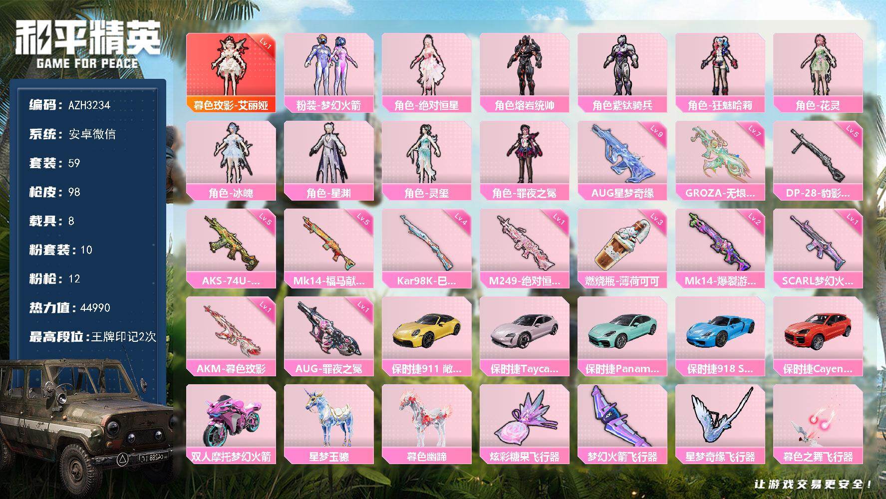 【AZH3234】安卓 微信【一级艾丽娅 梦幻火箭狂魅哈莉 满级星梦奇缘AUG 8载具】1神装-10粉装-12特效枪-8载具-4粉色飞行器-44990热力值-2王牌印记-59套装-98枪皮