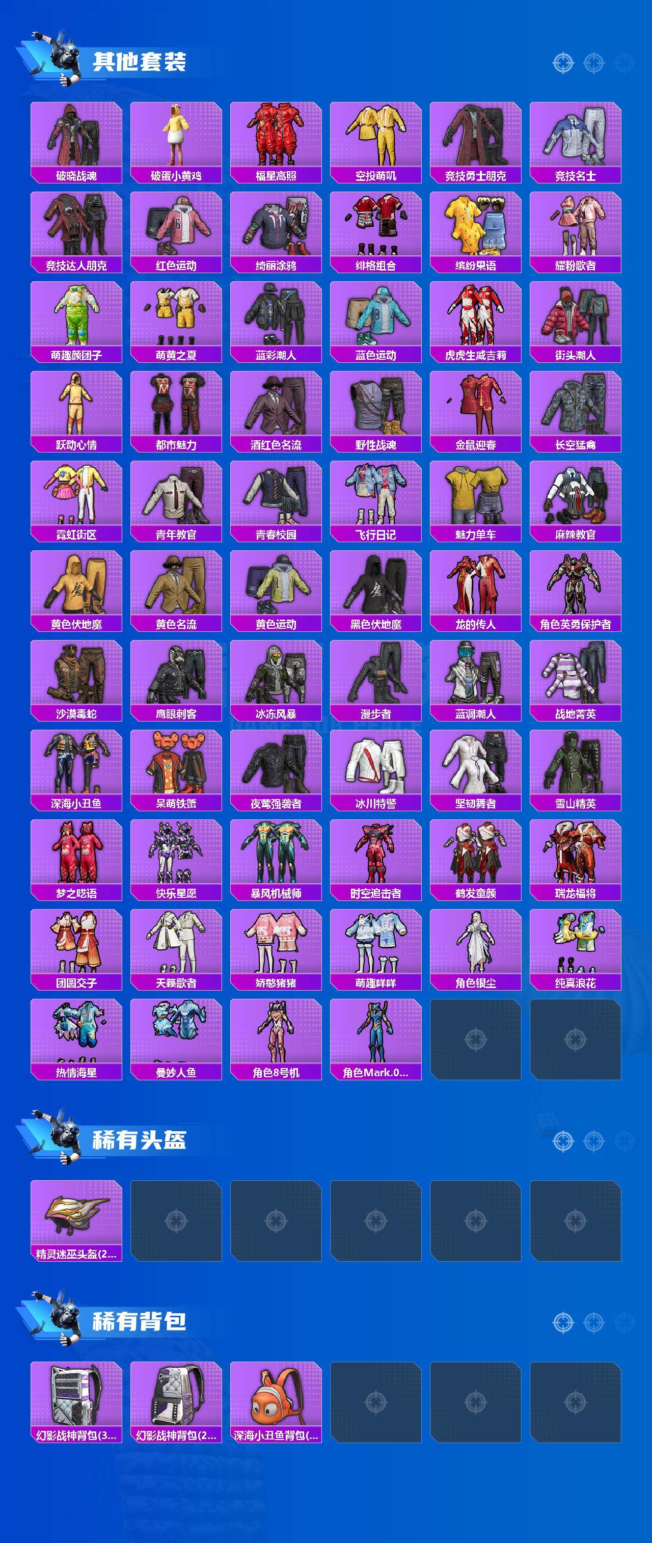 【热门品类】:套装-都市猎人,套装-派对舞王,套装-深海小丑鱼,套装-小丑鱼,套装-胖达团团,套装-SS1特训,套装-暗影哥特,角色-8号机,角色-Mark.06