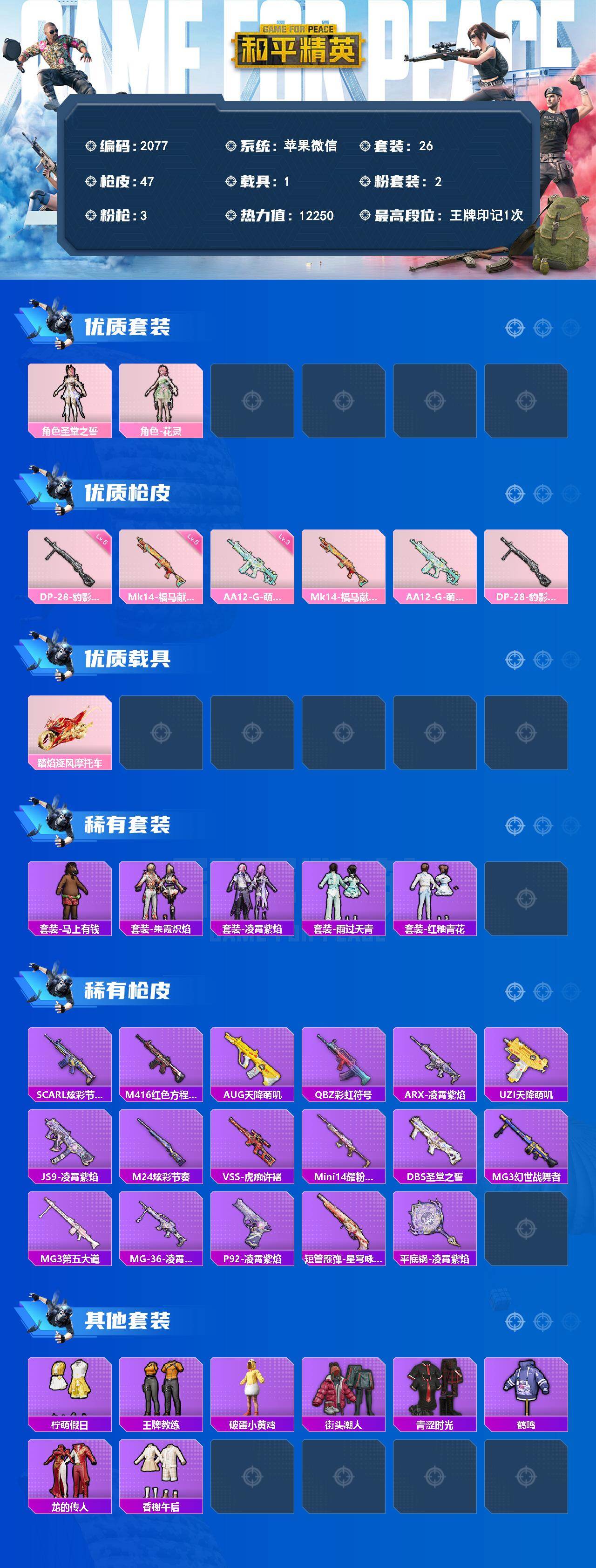 df苹果 微信-【特价出售微区账号微信一切正常,新手小号,花灵】2粉装-3特效枪-1载具-0粉色飞行器-12250热力值-1王牌印记-26套装-47枪皮