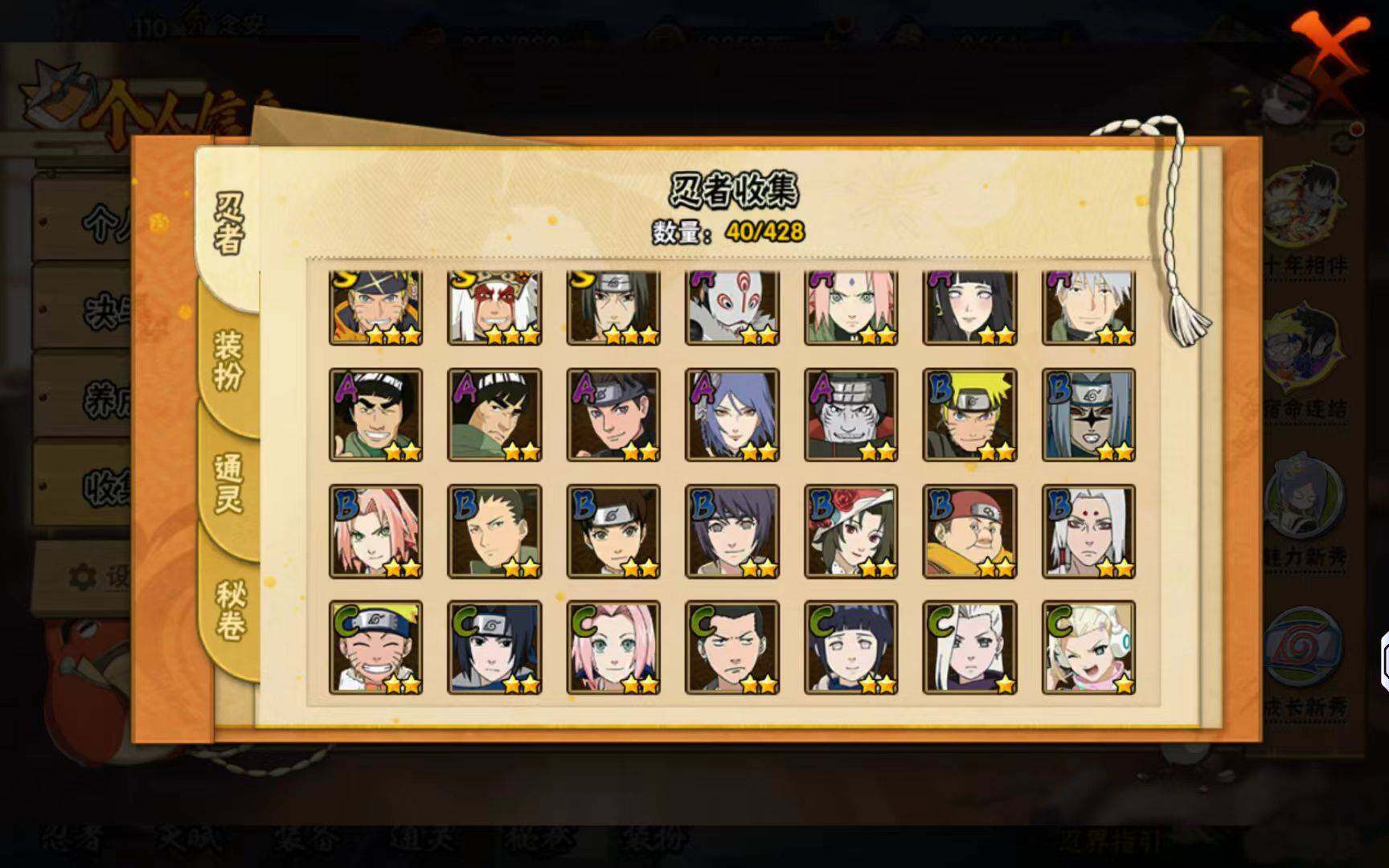 【A级忍者】:干柿鬼鲛(2星),迈特凯(2星),旗木卡卡西「幻之真容」(2星),小南「神驹佑将」(2星),猿飞日斩「火影继承人」(2星),日向雏田「最终章」(2星),神秘面具男「忍者之路」(2星),春野樱「百豪」(2星),迈特凯「青春爆炸」(2星)