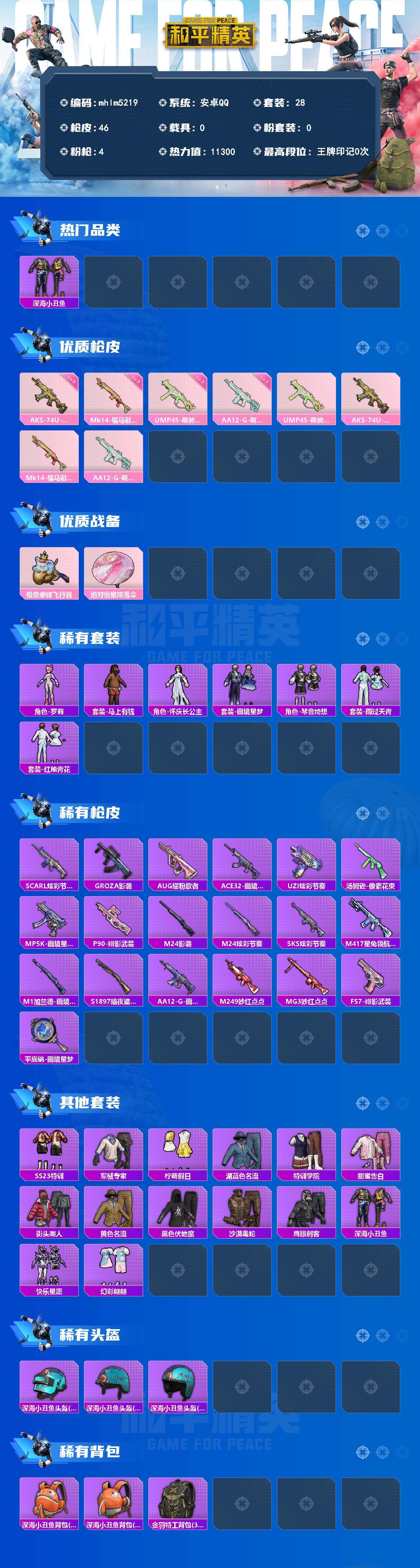 【mhlm5219】安卓 手Q-0粉装-4特效枪-0载具-1粉色飞行器-11300热力值-2王牌印记-28套装-46枪皮