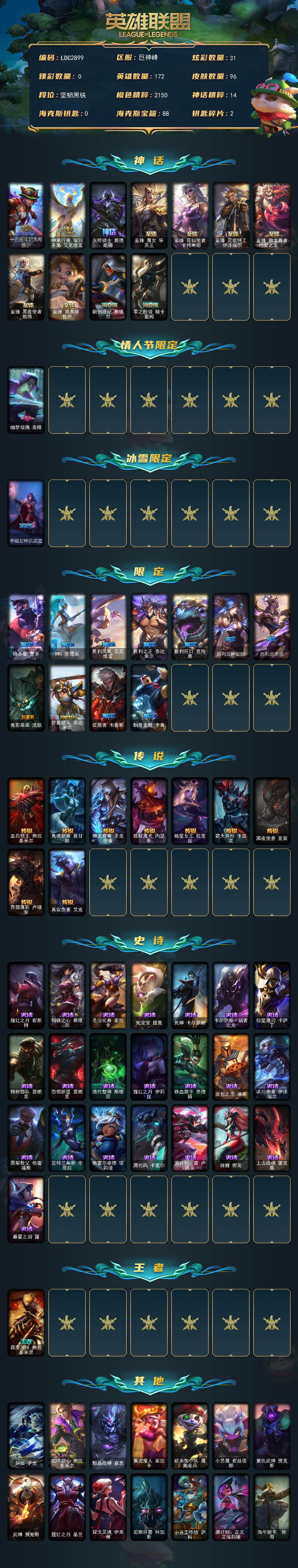 172英雄/96皮肤/11神话/13限定/31炫彩/9传说/22史诗/未定级账号等级:380/