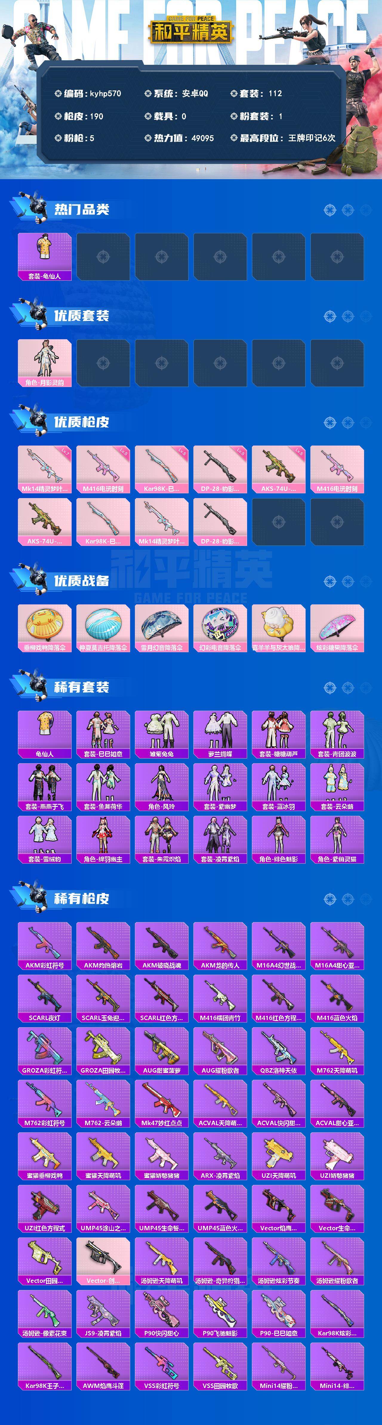 安卓 手Q-1粉装-5特效枪-0载具-0粉色飞行器-49095热力值-6王牌印记-112套装-190枪皮