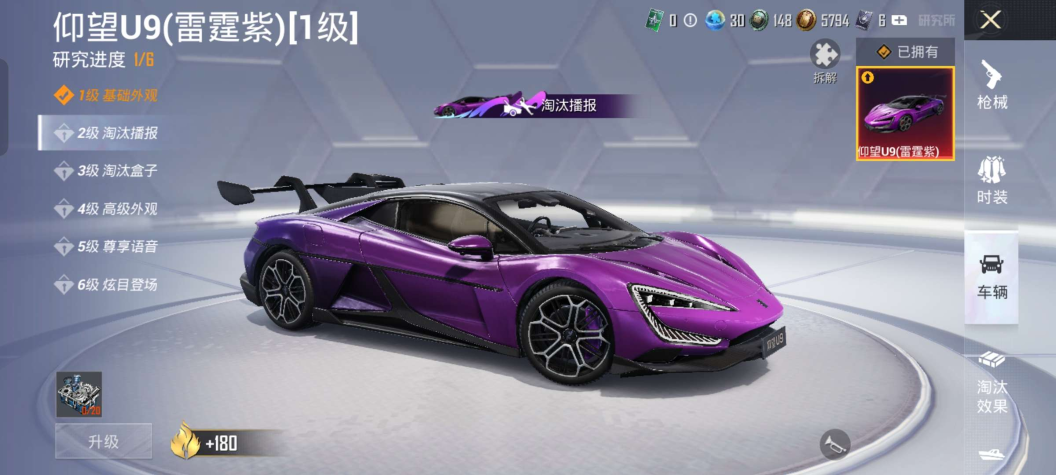 卓Q区-1升级载具 仰望U9(雷霆紫)王者8传说 无二次协助 6822热力值-14套装-15枪皮【优质载具皮肤】【稀有武器皮肤】: DBS-乌木金纹 SCAR-L-海盐豹豹 蜜獾-乌木金纹 AUG-天降萌叽 蜜獾-天降萌叽 Mini14-炫彩节奏 UZI-天降萌叽 MP5K-乌木金纹 P90-玩趣呆呆 DP-28-彩虹符号 MG3-幻世战舞者【其他套装】: SS28特训 猎鹰