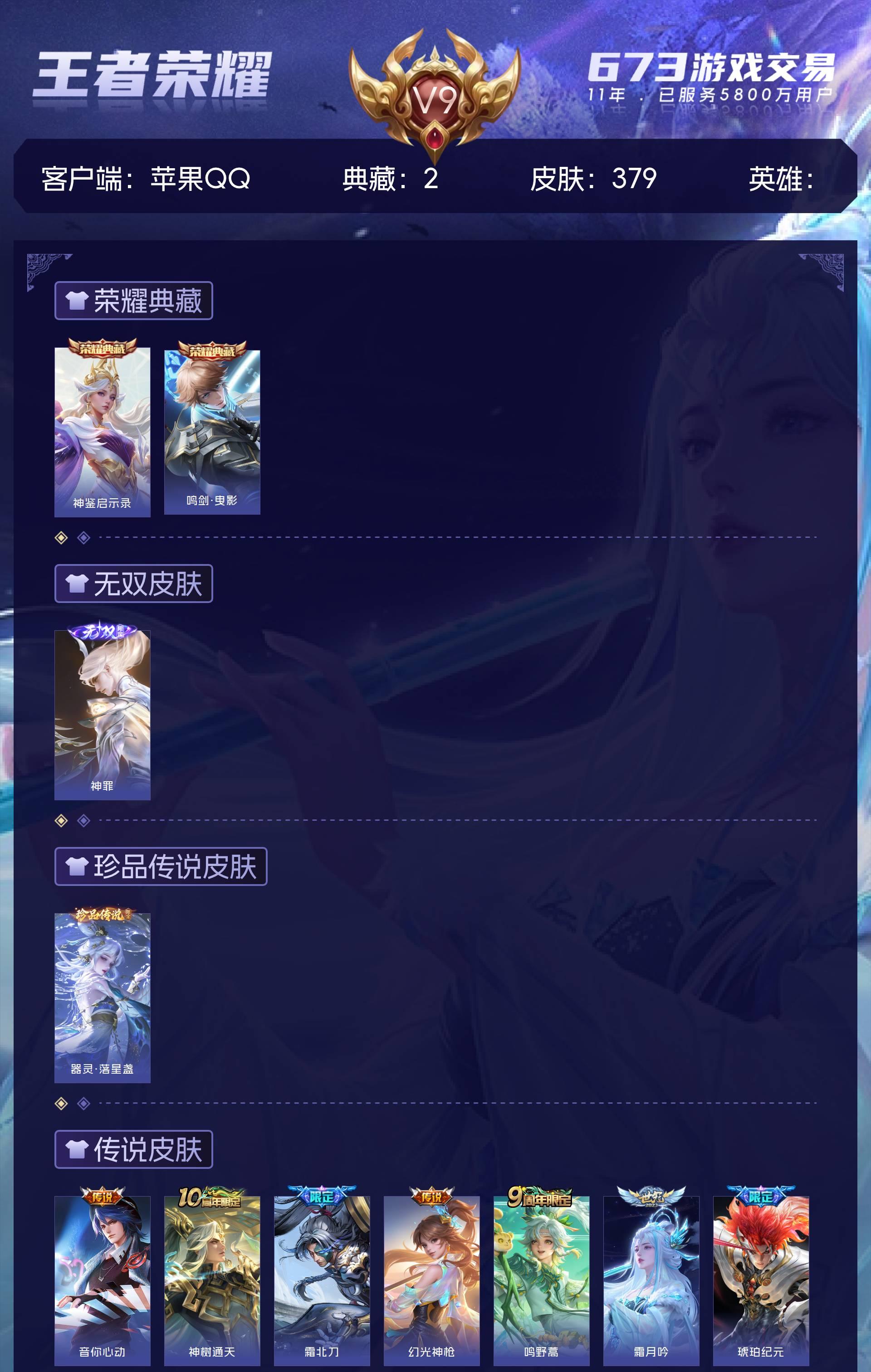 苹果QQ/至尊星耀/379皮肤/126英雄/2典藏/0珍品无双/1无双/1珍品传说/27传说/106