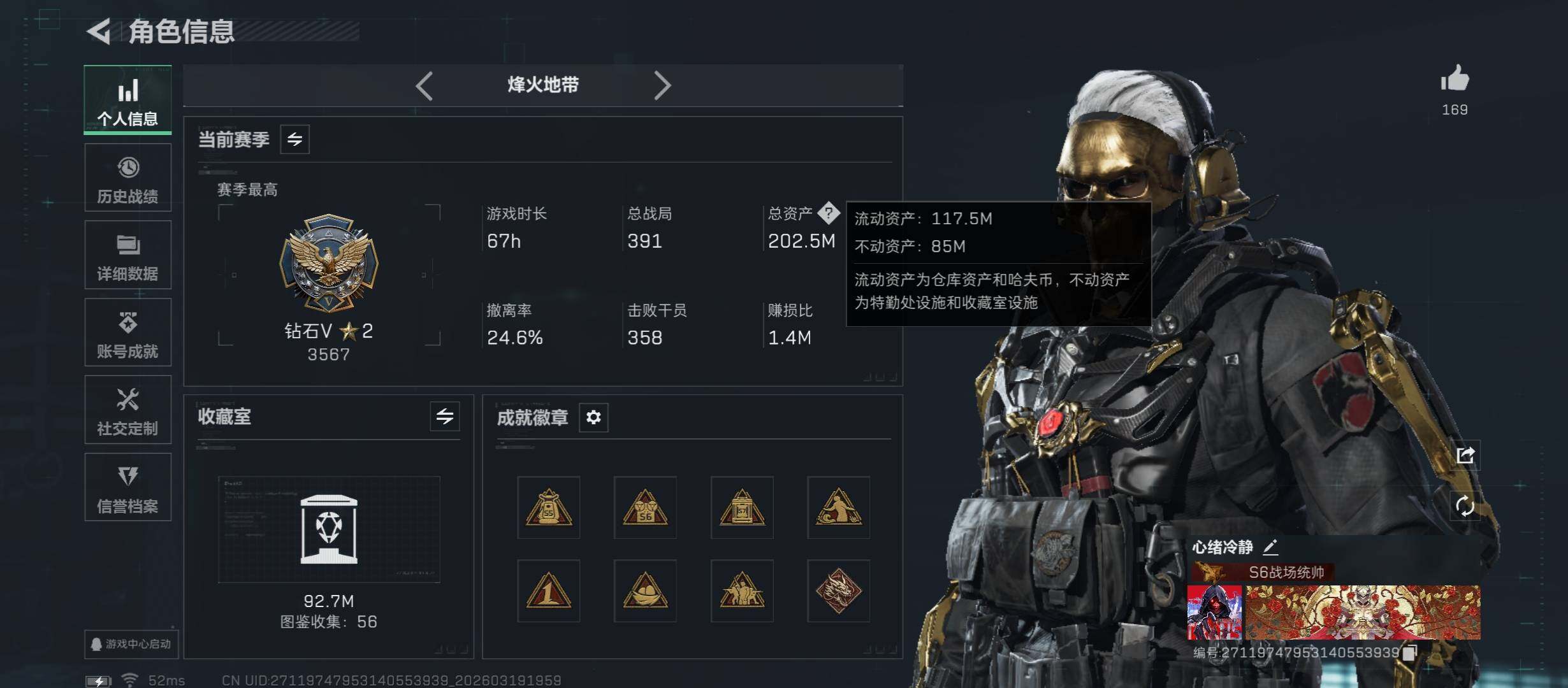 【高氪金土豪号-三红皮+二刀皮+一典藏皮肤】【北极星.怜悯.蚀金玫瑰.黑天际线.蛊能天使】【Q区三端互通】【无二次】YXz9387-特勤处:仓库8级/靶场6级/训练中心7级-总资产202m-哈夫币398w-烽火等级:60级