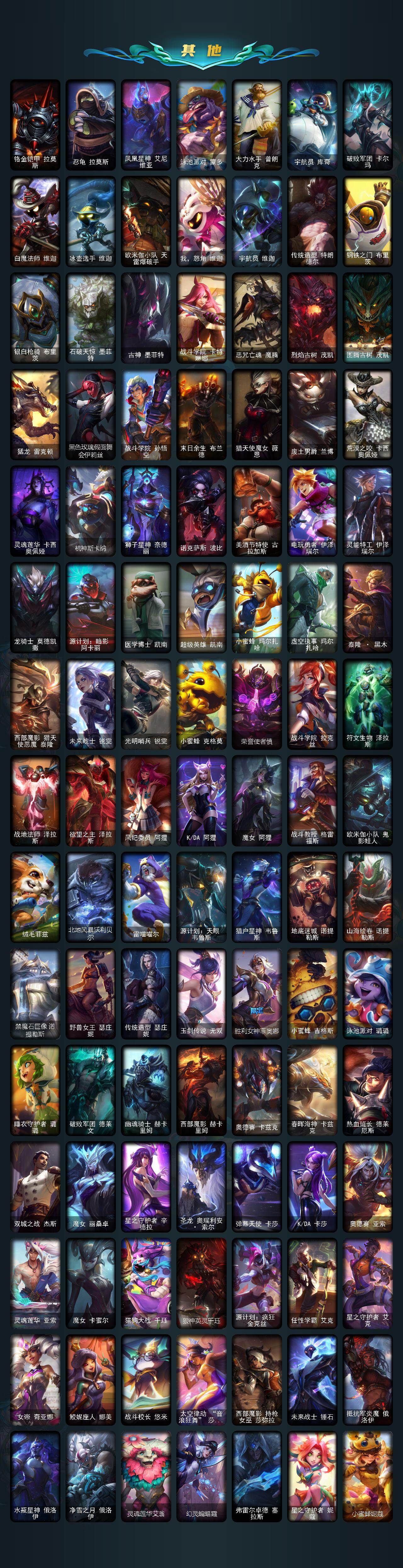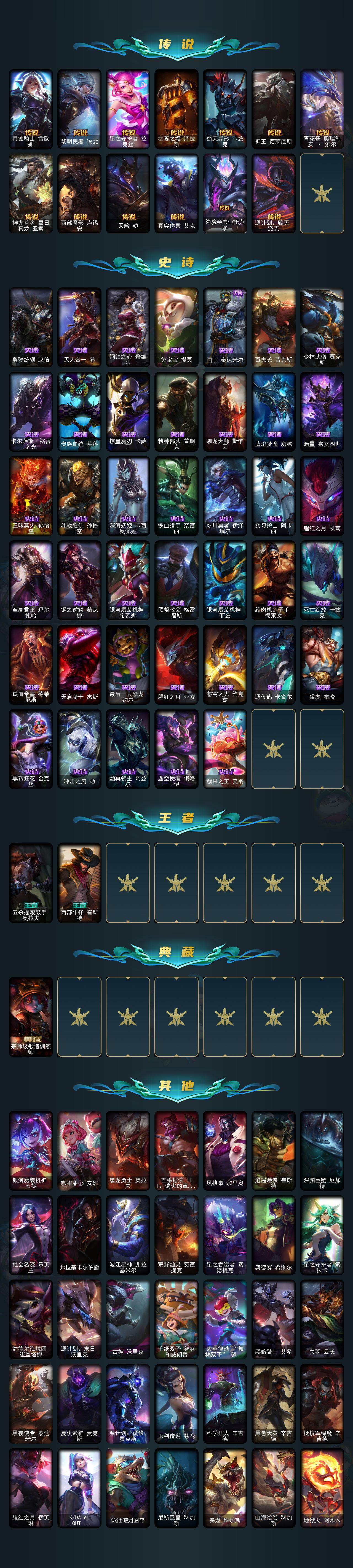 172英雄/279皮肤/7神话/47限定/10臻彩/339炫彩/34传说/40史诗/钻石/