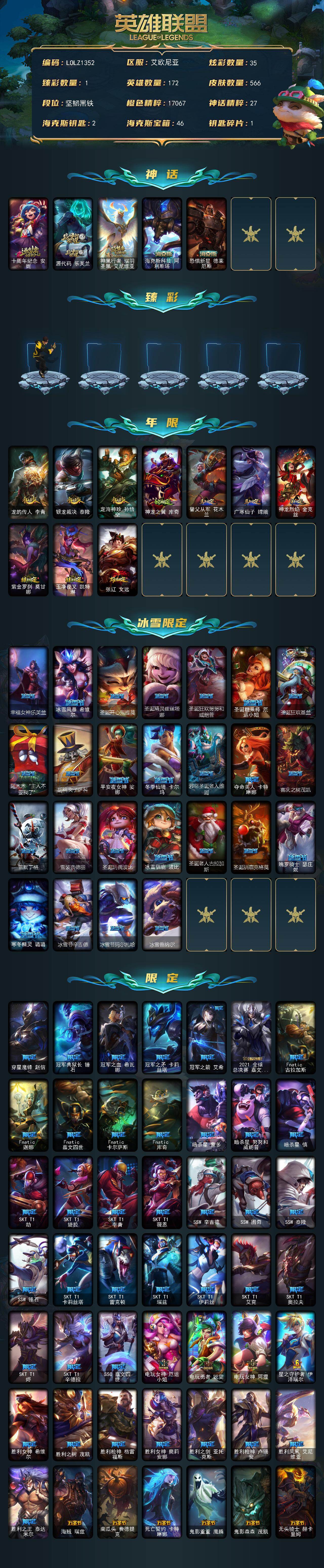 【LOLZ1352】172英雄/566皮肤/5神话/102限定/1臻彩/35炫彩/47传说/149史诗/未定级/十周年纪念安妮/源代码乐芙兰/神凰行者瑞羽圣凰艾尼维亚/海克斯科技阿利斯塔/恐惧新星德莱厄斯/龙的传人李青飞龙在天/龙的传人李青/银龙裁决泰隆/定海神珍孙悟空/神龙之翼库奇/替父从军花木兰/广寒仙子嫦娥/神龙烈焰金克丝/紫金罗刹莫甘娜/玉净夜叉凯特琳/张辽文远/幸福女神乐芙兰/冰雪风暴希维尔/圣诞开心鬼提莫/圣诞精灵崔丝塔娜/圣诞狂欢努努和威朗普/圣诞糖果棒厄运小姐/圣诞狂欢基兰/阿木
