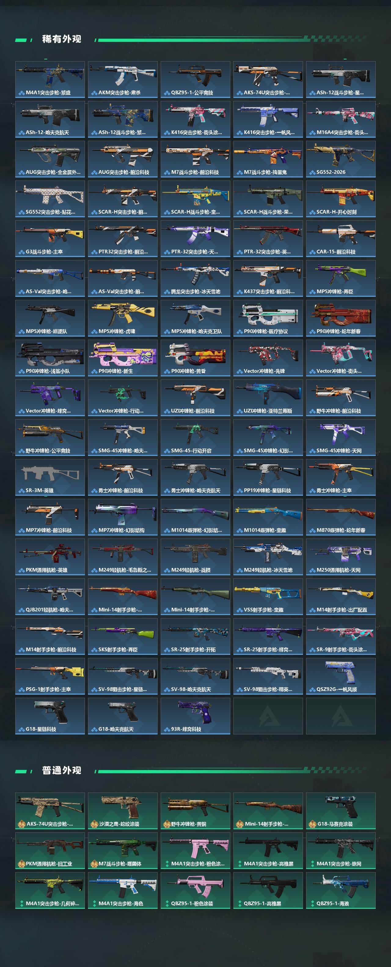 【传说外观】:M4A1突击步枪-蚀金玫瑰,M4A1突击步枪-阿米娅,QBZ95-1突击步枪-凌霄戍卫,ASh-12战斗步枪-鹅鸭杀,M7