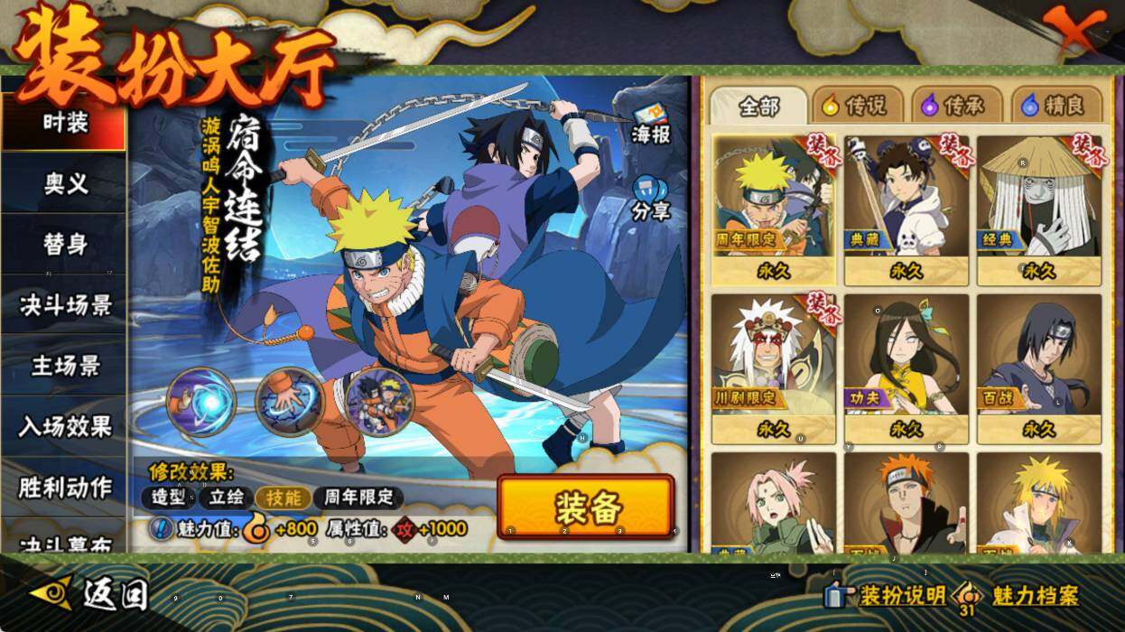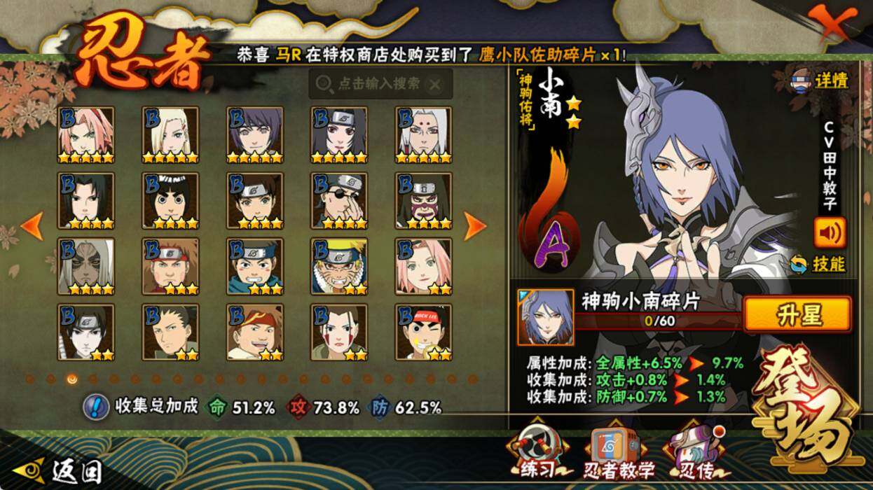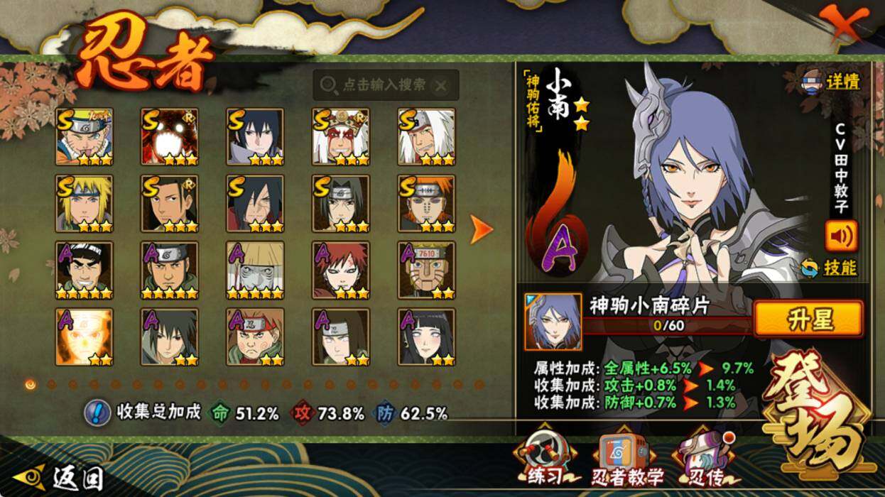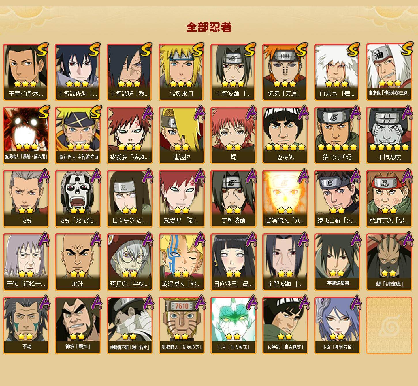 【S级忍者】:宇智波斑「秽土转生·解」(3星),宇智波鼬「须佐能乎」(3星),千手柱间「木叶创立」(3星),自来也「舞之豪杰」(3星),自来也「传说中的三忍」(3星),波风水门(3星),佩恩「天道」(3星),宇智波佐助「永恒万花筒」(3星),漩涡鸣人「暴怒·第六尾」(3星),漩涡鸣人·宇智波佐助(3星)