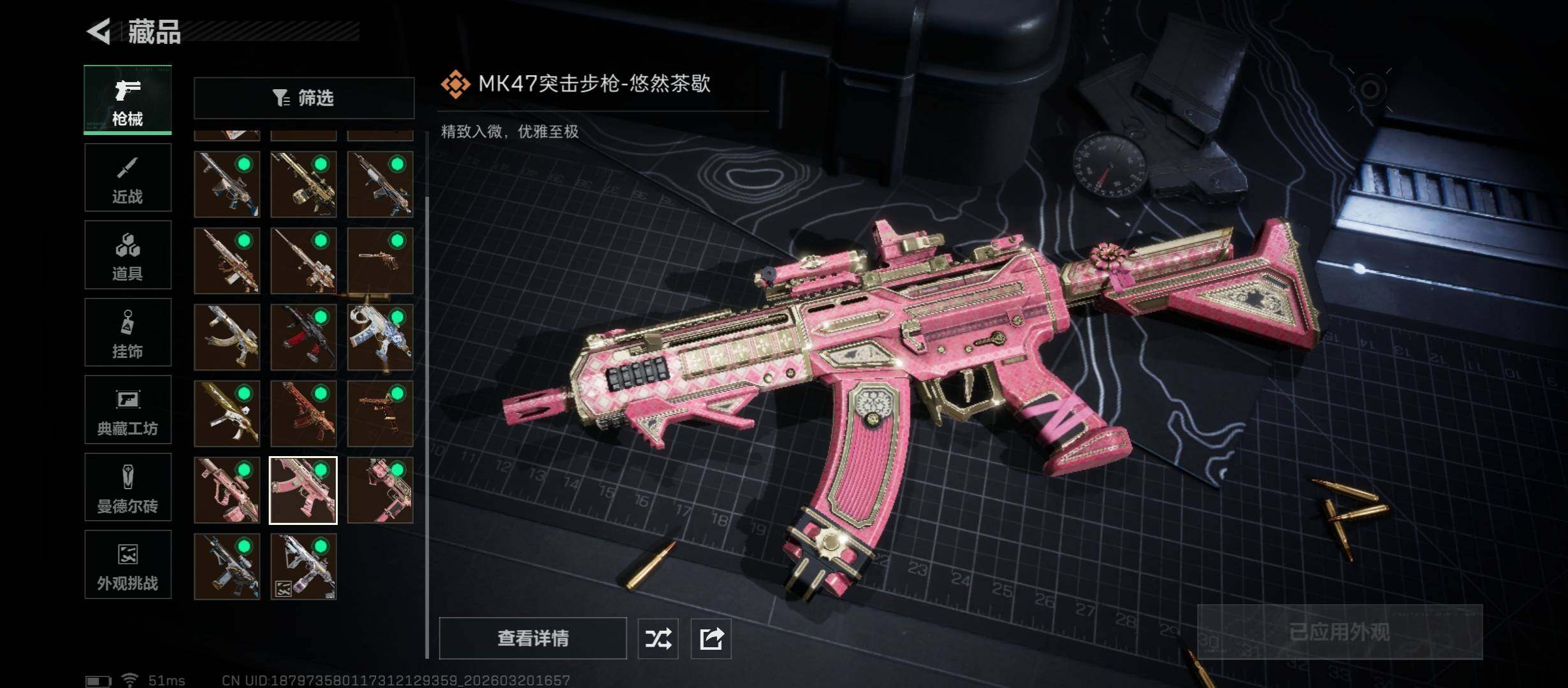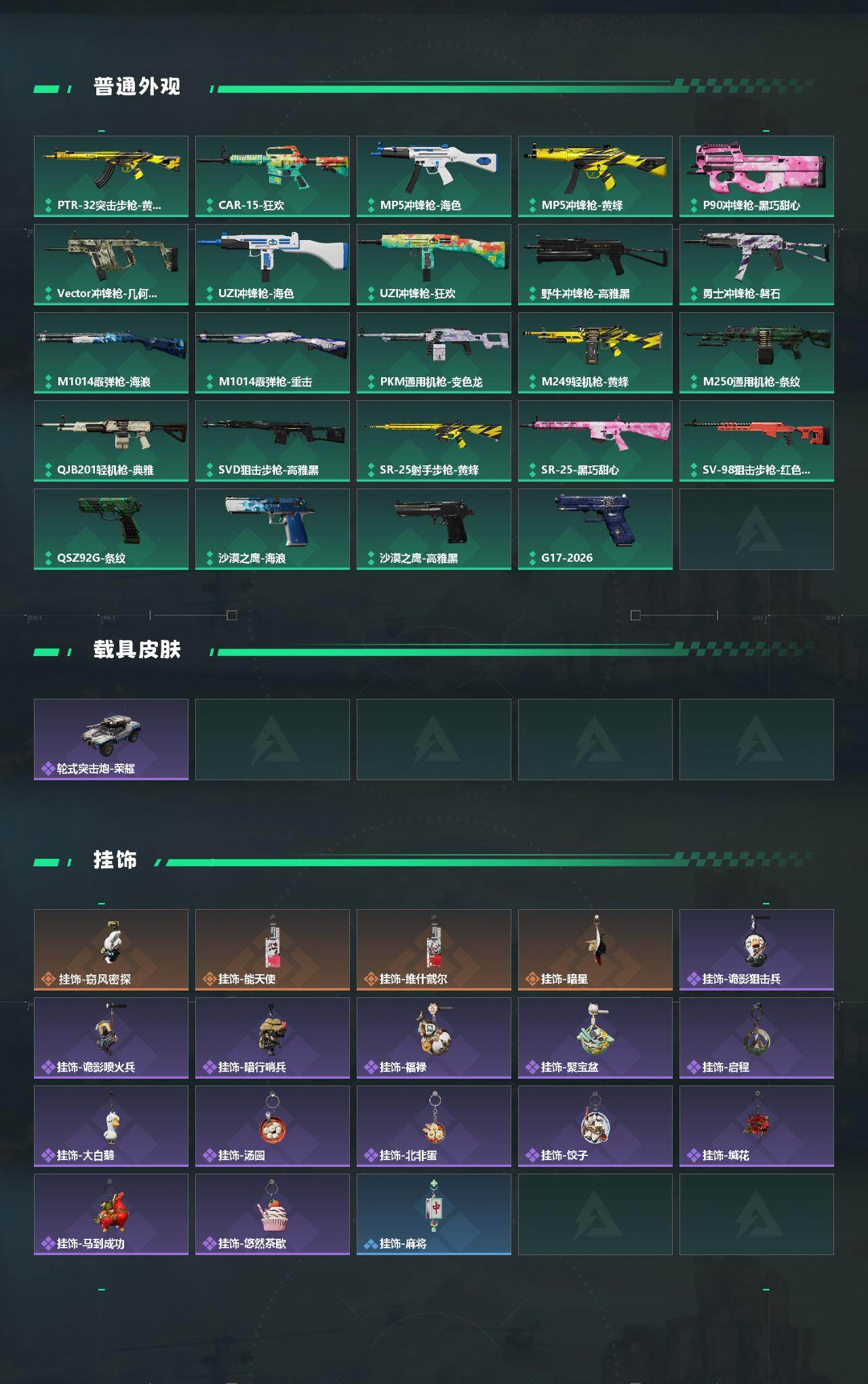 【传说外观】:M4A1突击步枪-蚀金玫瑰,ASh-12战斗步枪-鹅鸭杀,AUG突击步枪-悠然茶歇,SCAR-H战斗步枪-水墨云图,