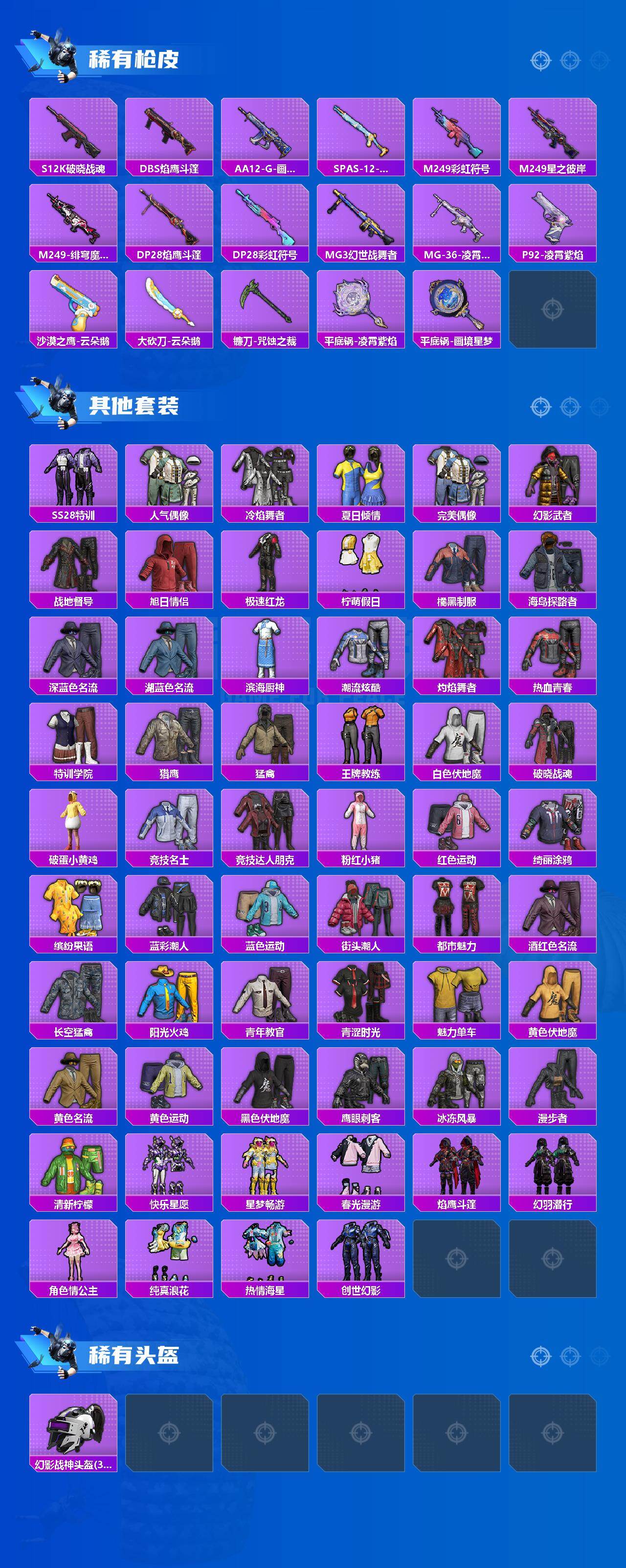 【粉色枪皮等级】:M416-电玩时刻(五级),ACE32-萌骑漫游(四级),UMP45-量子极限(五级),AKS-74U-森灵之息(五级),Kar98K-巳巳如意(五级),Mk14-福马献瑞(五级)