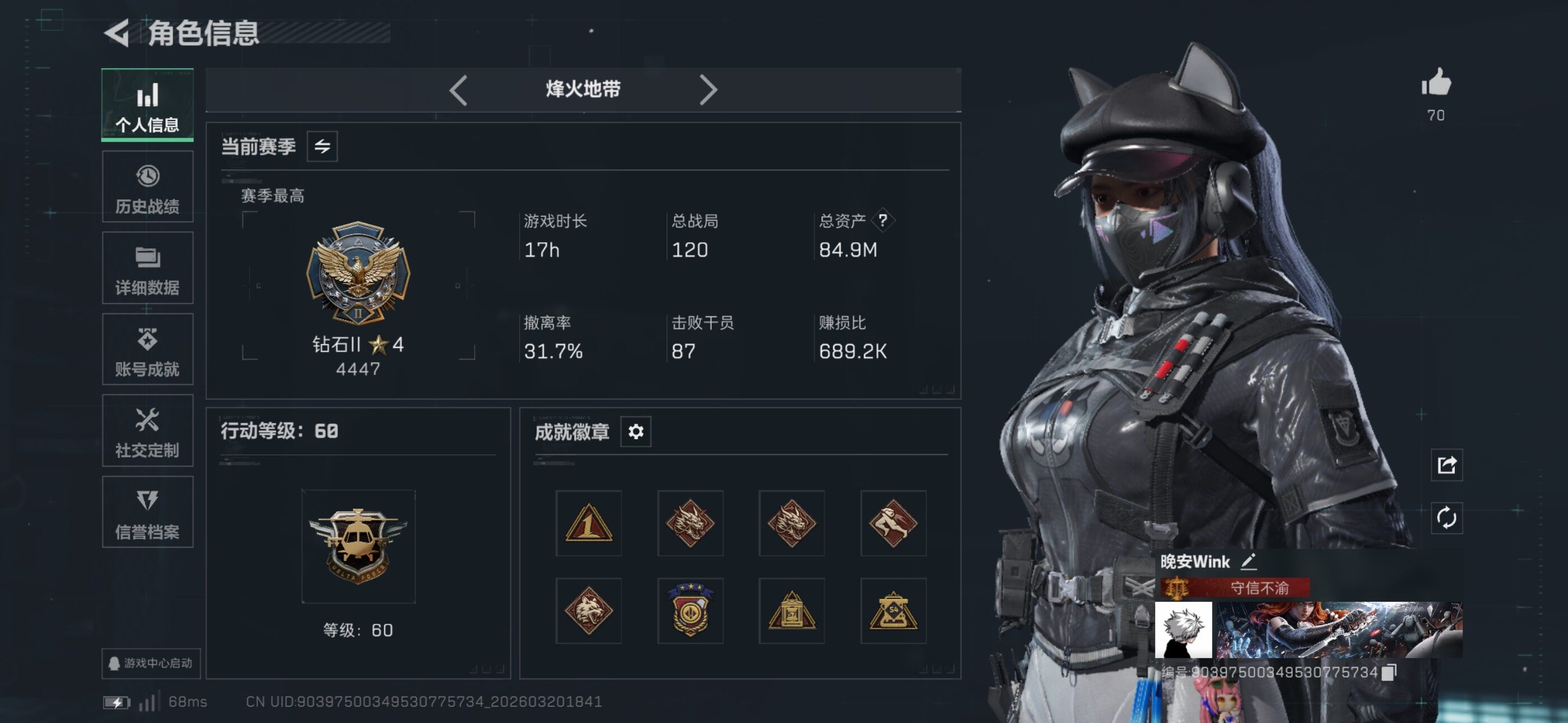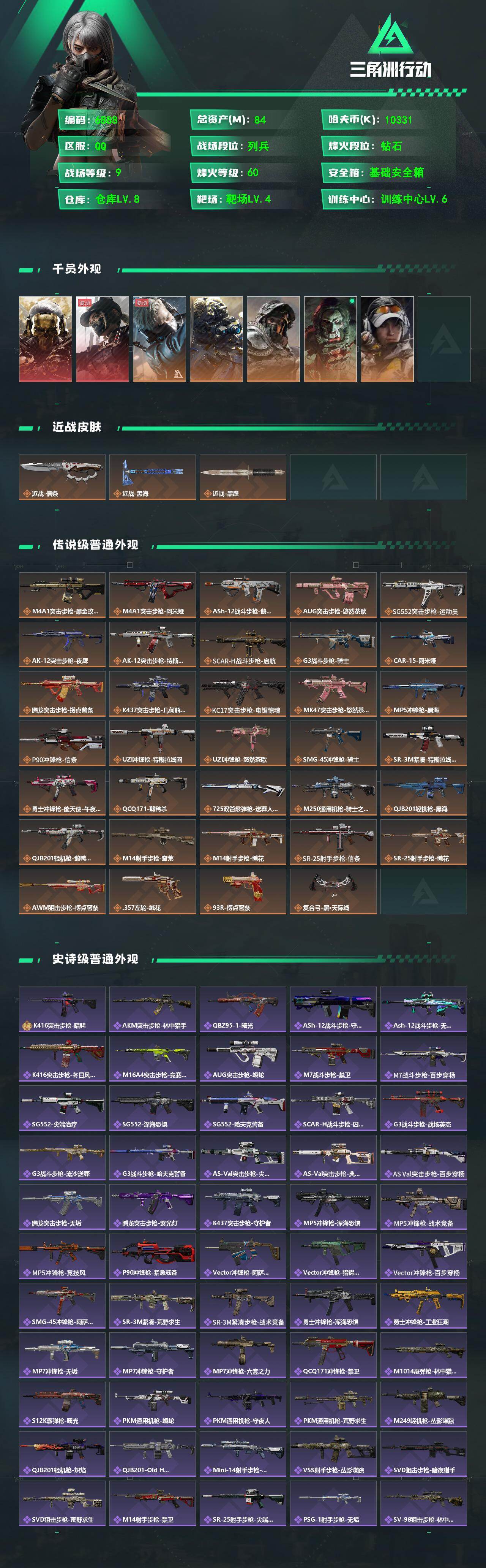 等级:总资产:84.9M 纯币 隐藏挂饰: 红皮:露娜-黑天际线/红狼-蚀金玫瑰/ 刀皮: 近战-信条/近战-黑海/ 特勤处:仓库8,训练6,靶场4