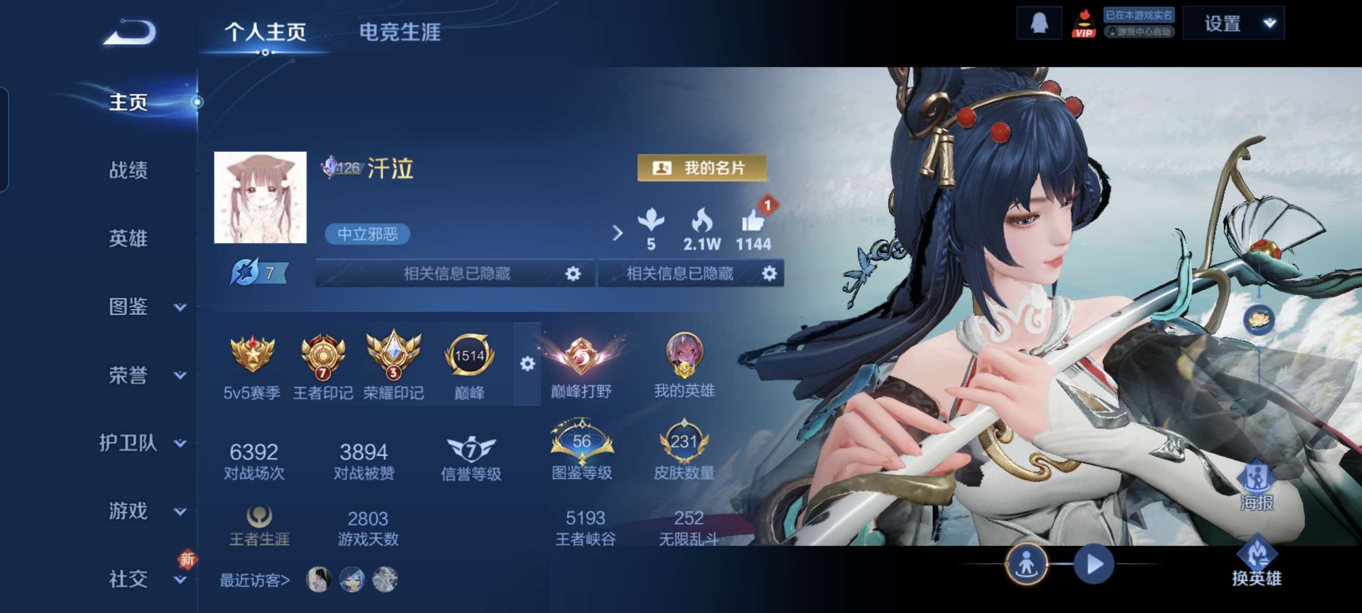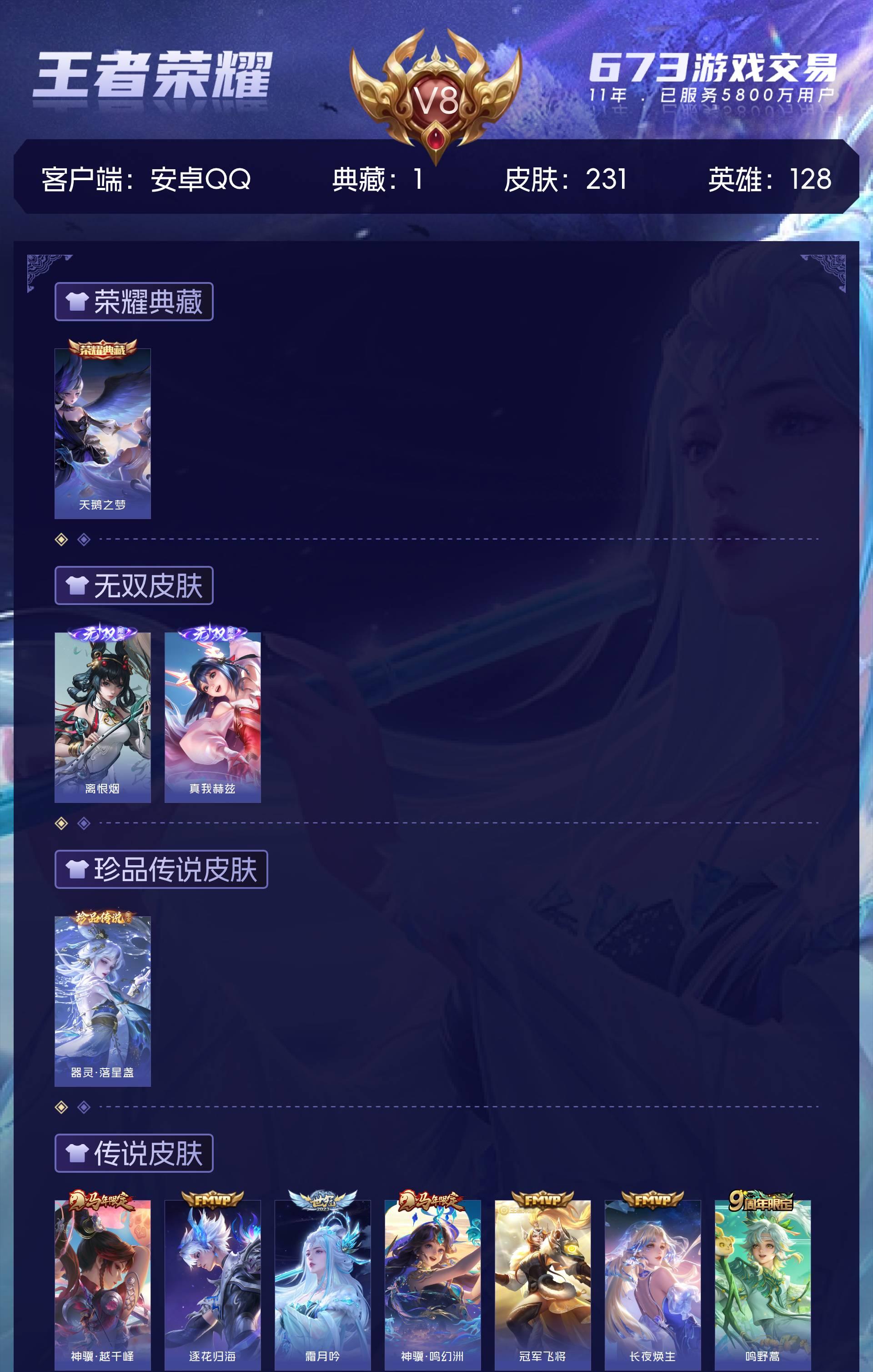 V8 皮肤231 英雄128 绝世王者 荣耀典藏1 无双皮肤2 珍品传说1 星传说1 传说19