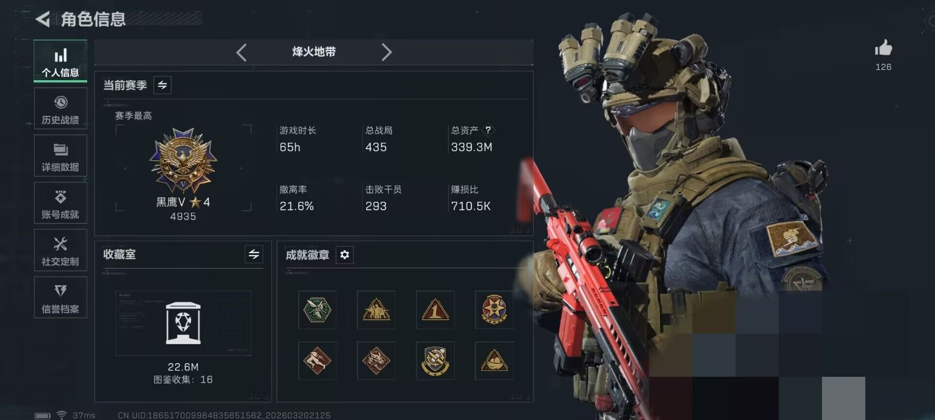 总资产(M):339M/哈夫币(K):164223K/传说枪皮数:33/全面战场等级:28_段位:列兵/烽火地带等级:60_段位:黑鹰/