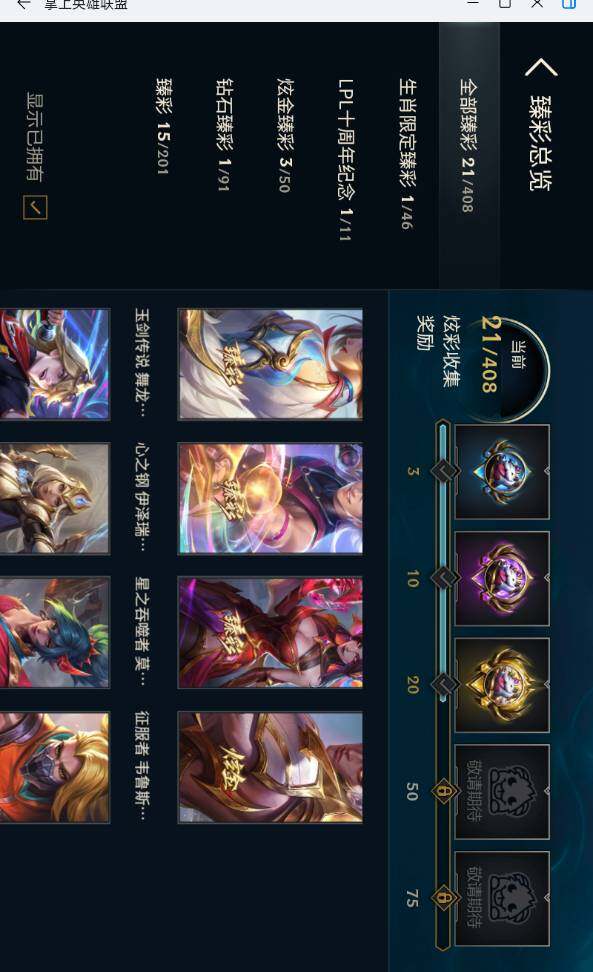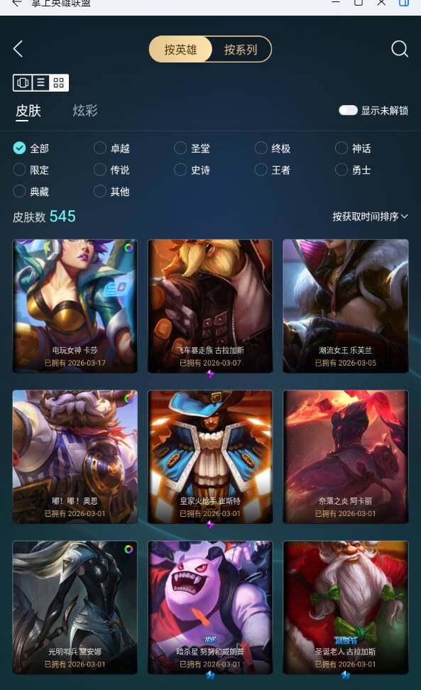 青铜段位-172英雄-545皮肤-217炫彩-1终极-25神话-62限定-57传说-119史诗