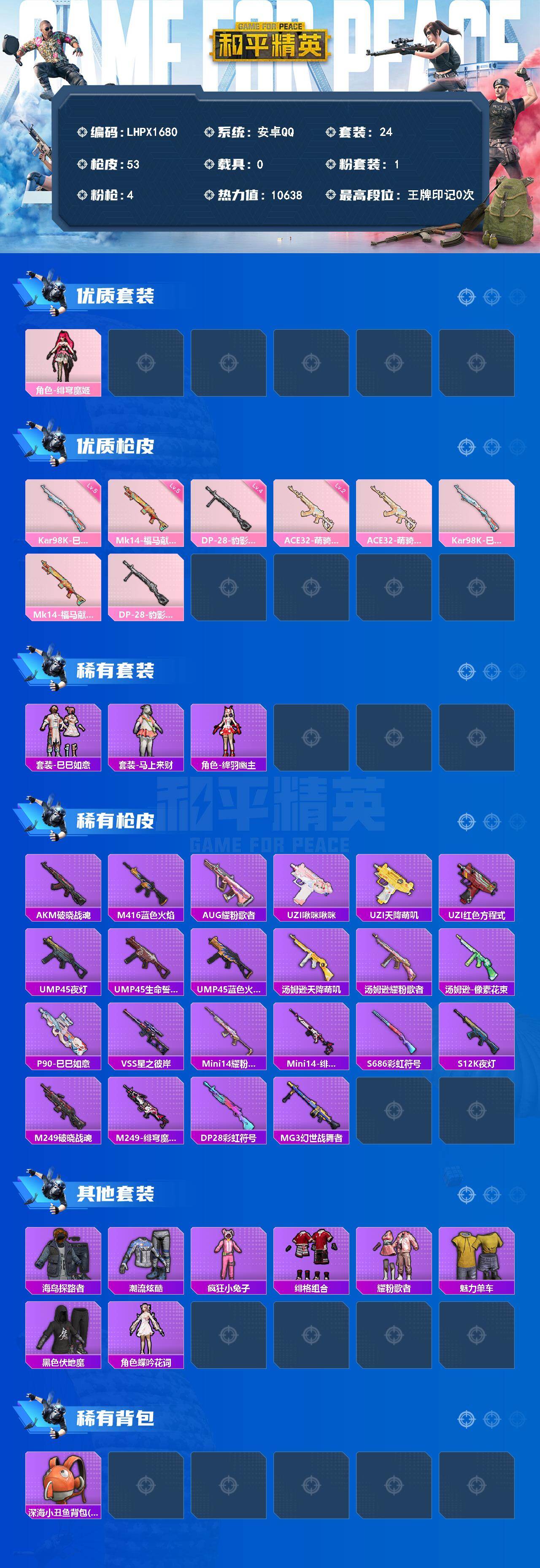 可二次【特价出售/店主推荐】安卓 手Q-1粉装-4特效枪-10638热力值-1王牌印记-24套装-53枪皮【粉色套装】:角色-绯穹魔姬【粉色枪皮等级】:ACE32-萌骑漫游(二级),Kar98K-巳巳如意(五级),Mk14-福马献瑞(五级),DP-28-豹影疾电(四级)