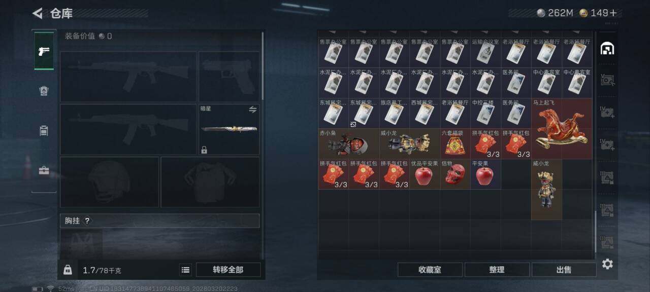 总资产(M):522M/哈夫币(K):262326K/传说枪皮数:28/全面战场等级:50_段位:军士长/烽火地带等级:60_段位:黑鹰/