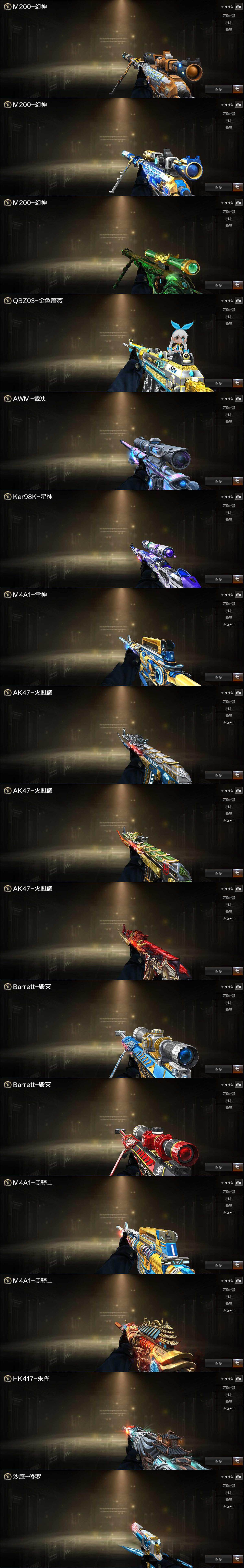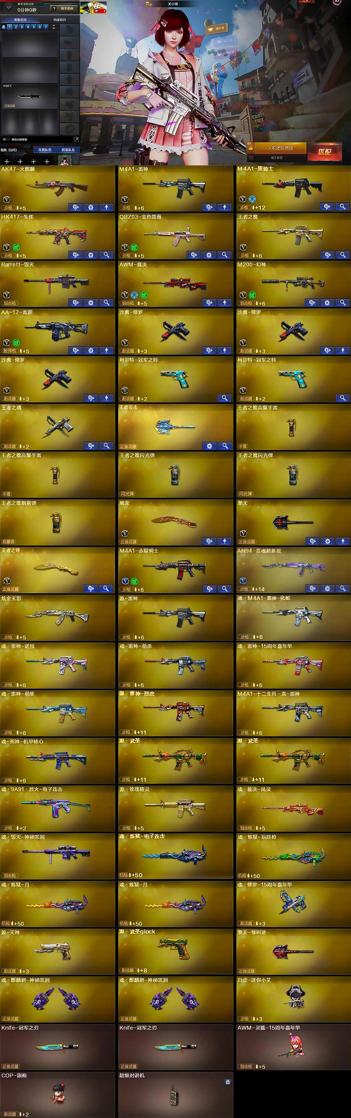幻神三件套!三皮幻神!超多精品皮肤!陕西一区-20V-9王者武器数-1炫金武器数【热门武器】:QBZ03-金色蔷薇,HK417-朱雀,M200-幻神,柯尔特-冠军之特*2,M4A1-黑骑士,沙鹰-修罗*3,Knife-冠军之刃*2,黄金猫猫手套-白鲨【王者炫金武器】:王者之魂,王者云击,王者之魄高爆手雷*2,王者之魄闪光弹*2,王者之魄烟雾弹,炫金无影【音效卡】:M200-幻神音效卡,M4A1-雷神音效卡,Barrett-毁灭音效卡,QBZ03-金色蔷薇音效卡,绝迹语音包,白鲨语音包,AWM-昌