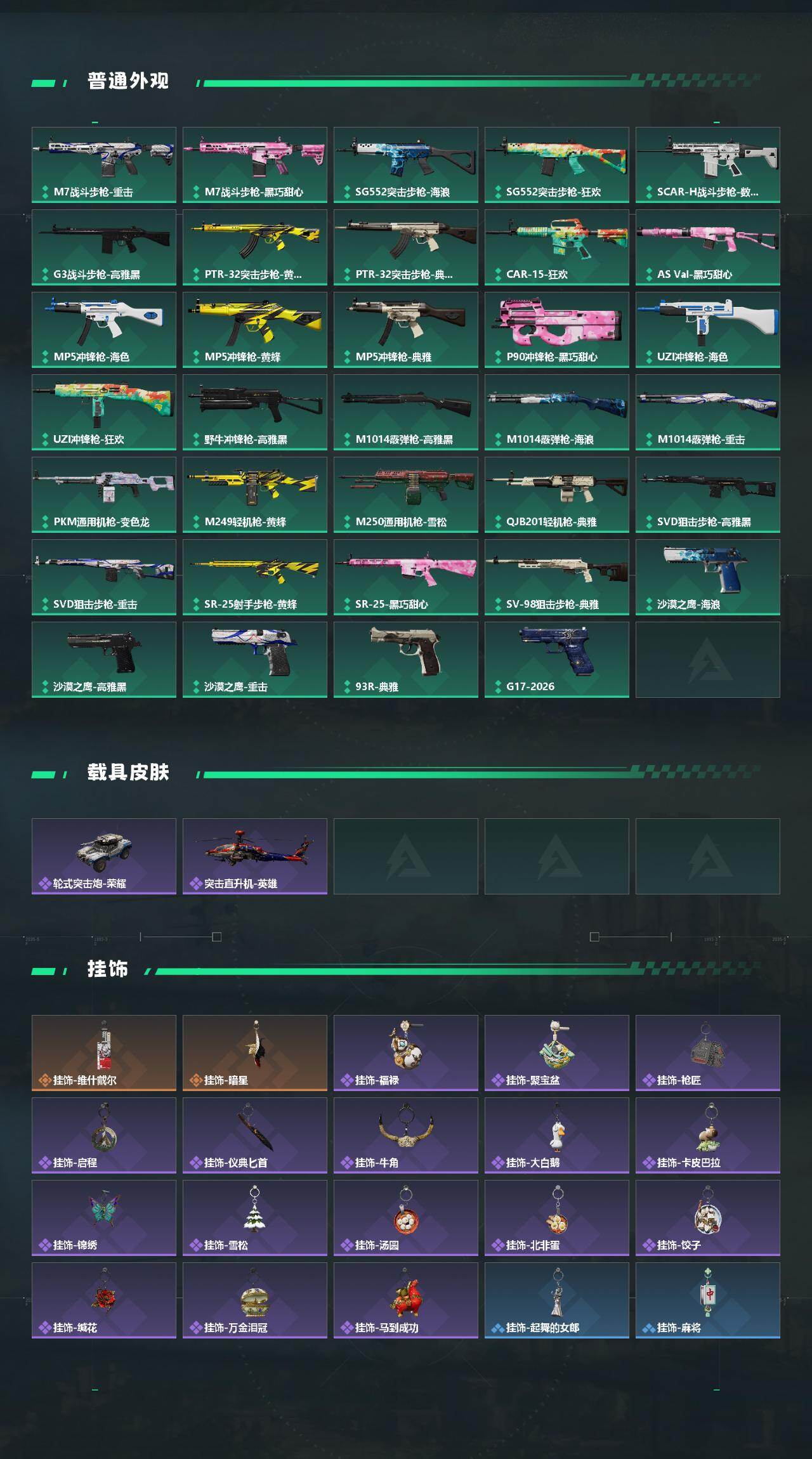 【传说外观】:AKM突击步枪-锦绣,ASh-12战斗步枪-鹅鸭杀,K416突击步枪-行动记录,SCAR-H战斗步枪-启航,腾龙突击步枪-马年祥瑞,腾龙突击步枪-万金泪冠,K437突击步枪-锦绣,MK47突击步枪-暗星,S