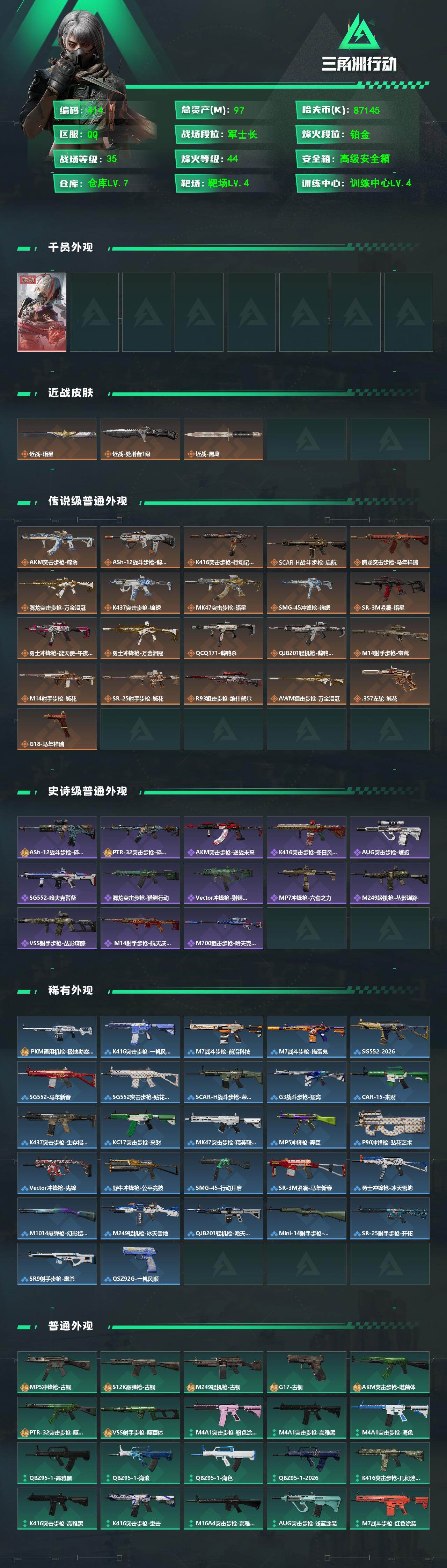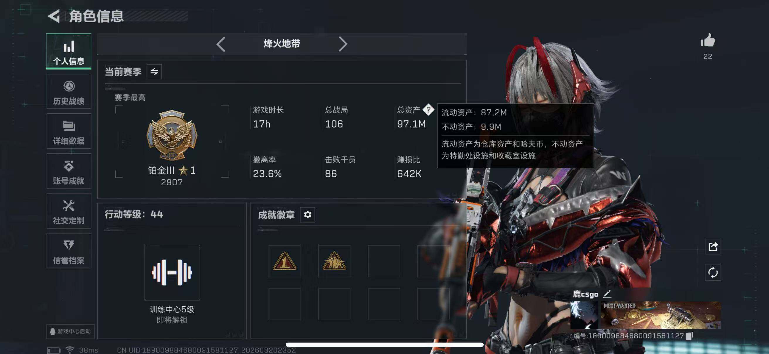 97m总资产-87145k哈夫币-44烽火等级-铂金-35战场等级-军士长