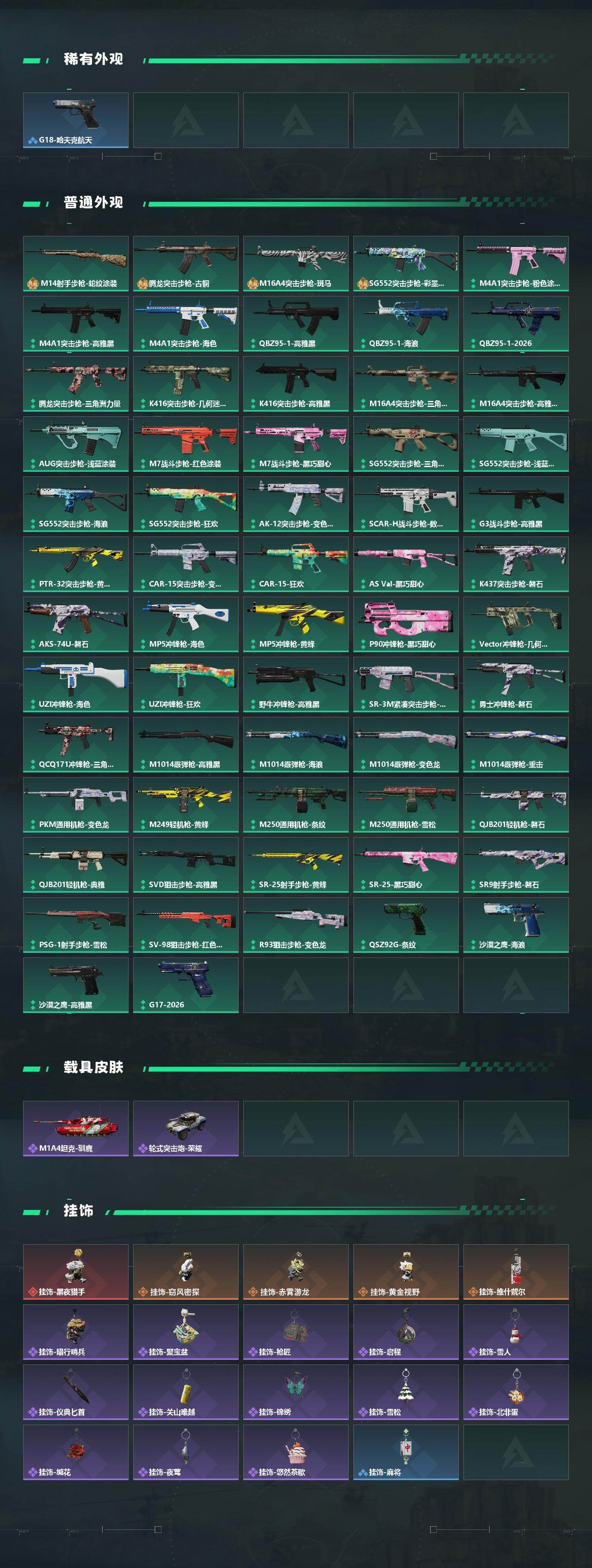【传说外观】:M4A1突击步枪-阿米娅,AKM突击步枪-锦绣,AUG突击步枪-悠然茶歇,SG552突击步枪-运动员,SCAR-H战斗步枪-启航,G3战斗步枪-骑士,K437突击步枪-几何解构,K437突击步枪-锦绣,KC17突击步枪-电锯惊魂,MK47突击步枪-悠然茶歇,Vector冲锋枪-夜莺,UZI冲锋枪-悠然茶歇,SMG-45冲