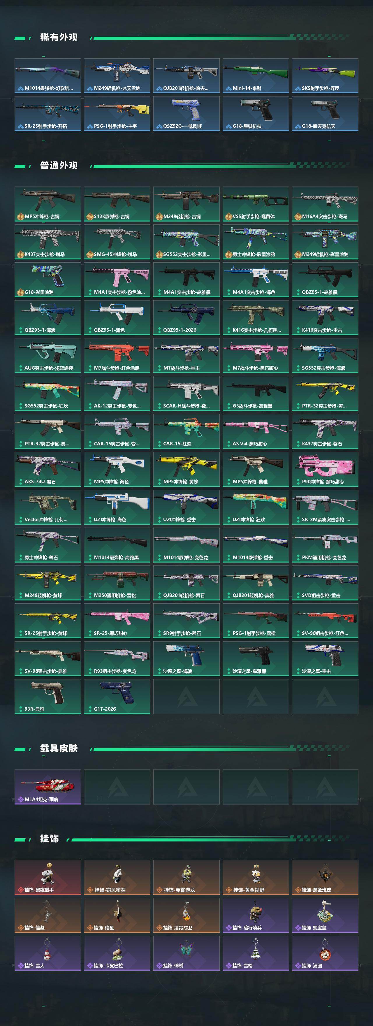 【传说外观】:M4A1突击步枪-蚀金玫瑰,AKM突击步枪-锦绣,QBZ95-1突击步枪-凌霄戍卫,K416突击步枪-行动记录,AUG突击步枪-悠然茶歇,M7战斗步枪-怜悯,SG552突击步枪-运动员,SCAR-H战斗步枪-水墨云图,腾龙突击步枪-马年祥瑞,腾龙突击步枪-万金泪冠,K437突击步枪