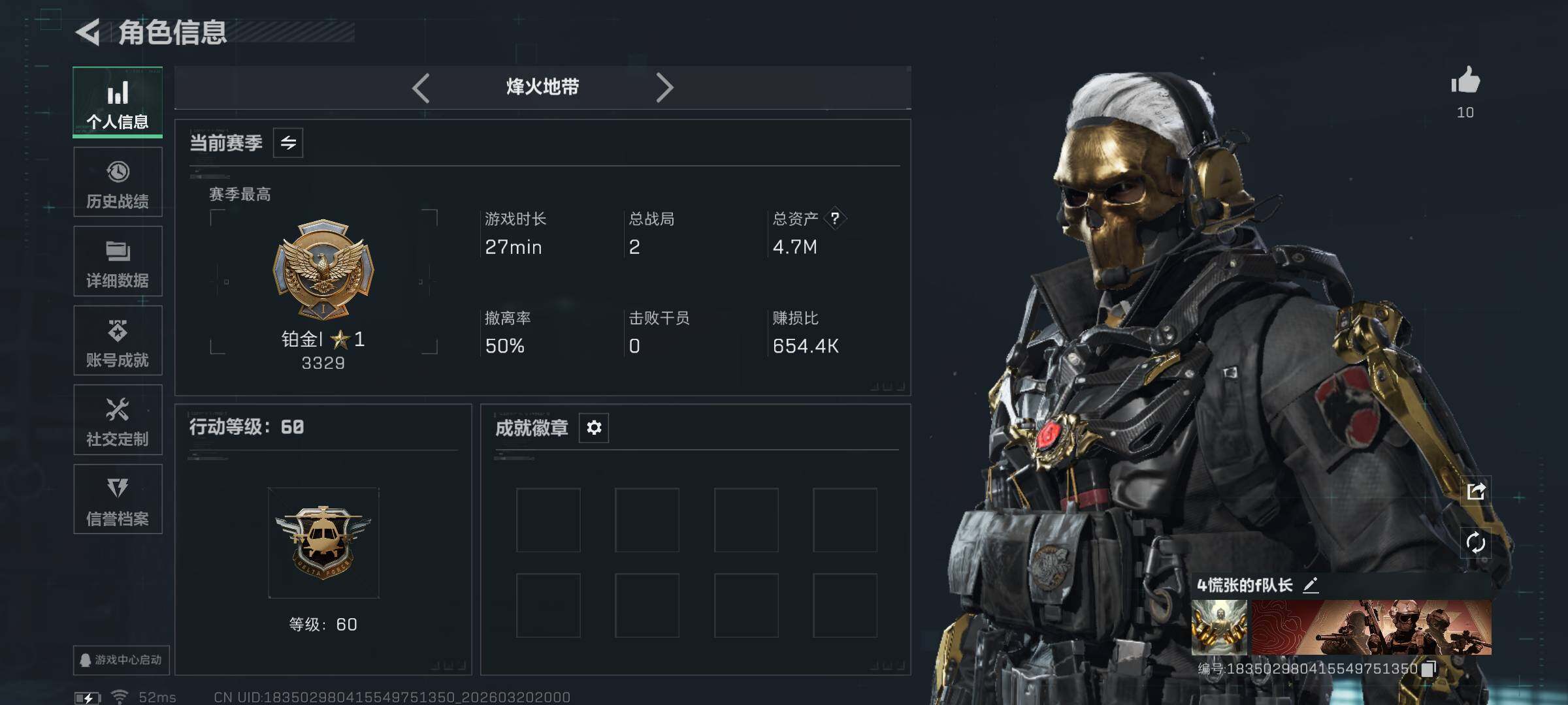 4m总资产-1635k哈夫币-60烽火等级-铂金-1战场等级-无军衔