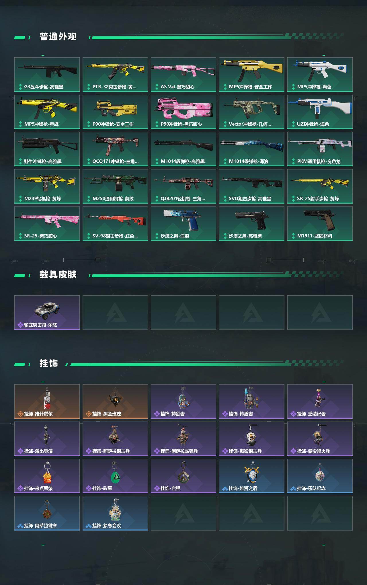【传说外观】:M4A1突击步枪-蚀金玫瑰,SCAR-H战斗步枪-启航,腾龙突击步枪-捞点薯条,勇士冲锋枪-能天使-午夜邮差,SR-25射手步枪-水墨云图,R93狙击步枪-维什戴尔,AWM狙击步枪-捞点薯条,93R-捞点薯条