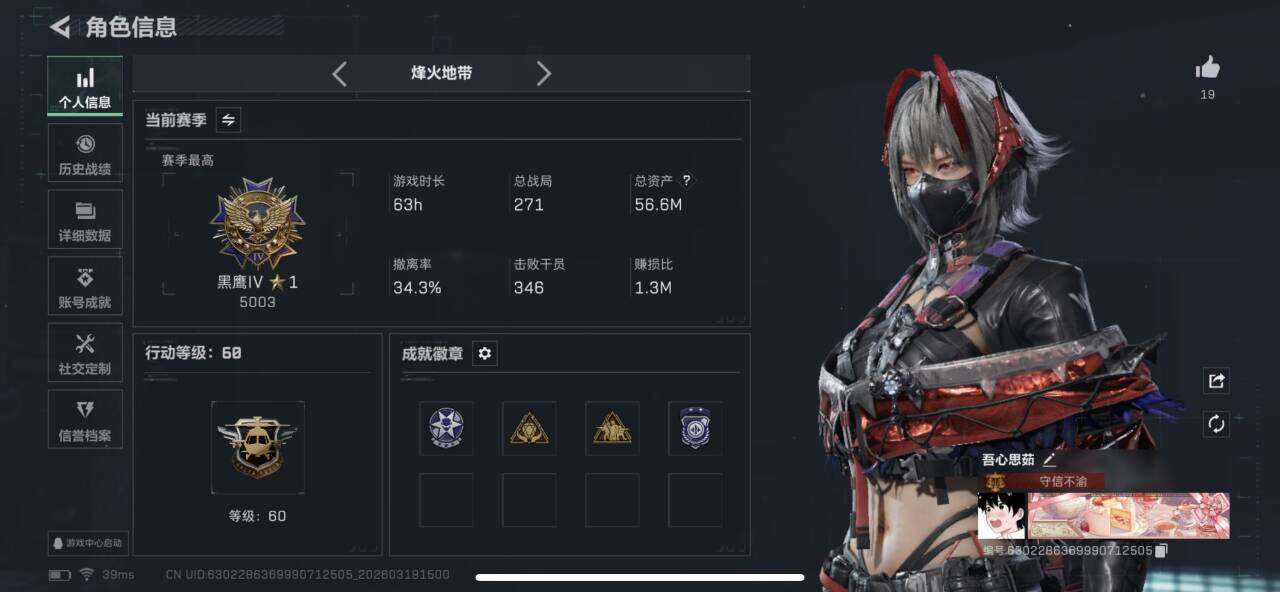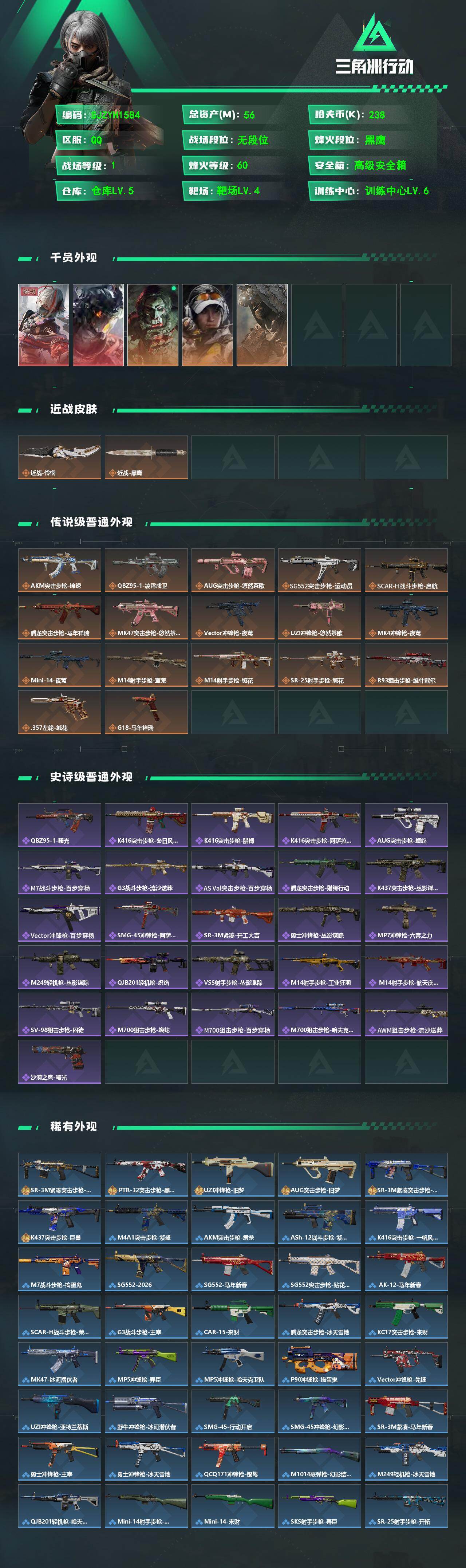 56m总资产-238k哈夫币-60烽火等级-黑鹰-1战场等级-无军衔