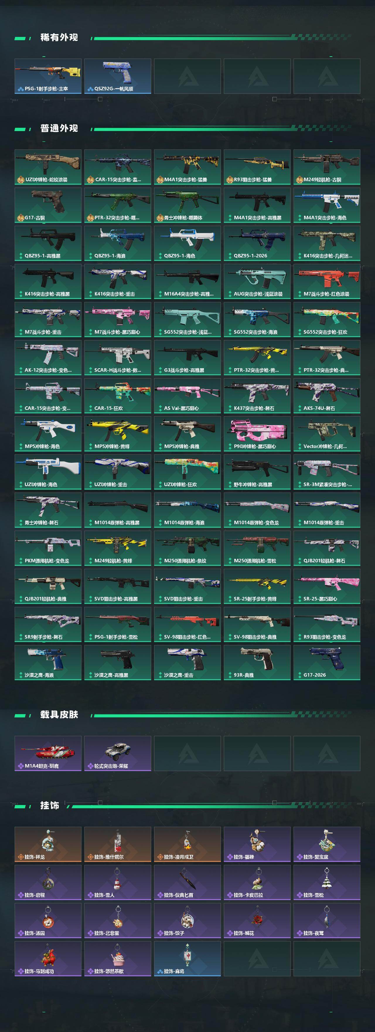 【传说外观】:AKM突击步枪-锦绣,QBZ95-1突击步枪-凌霄戍卫,AUG突击步枪-悠然茶歇,SG552突击步枪-运动员,SCAR-H战斗步枪-启航,腾龙突击步枪-马年祥瑞,MK47突击步枪-悠然茶歇,Vector冲锋枪-夜莺,UZI冲锋枪-悠然茶歇,MK4冲锋枪-夜莺,Mini-14射手步枪