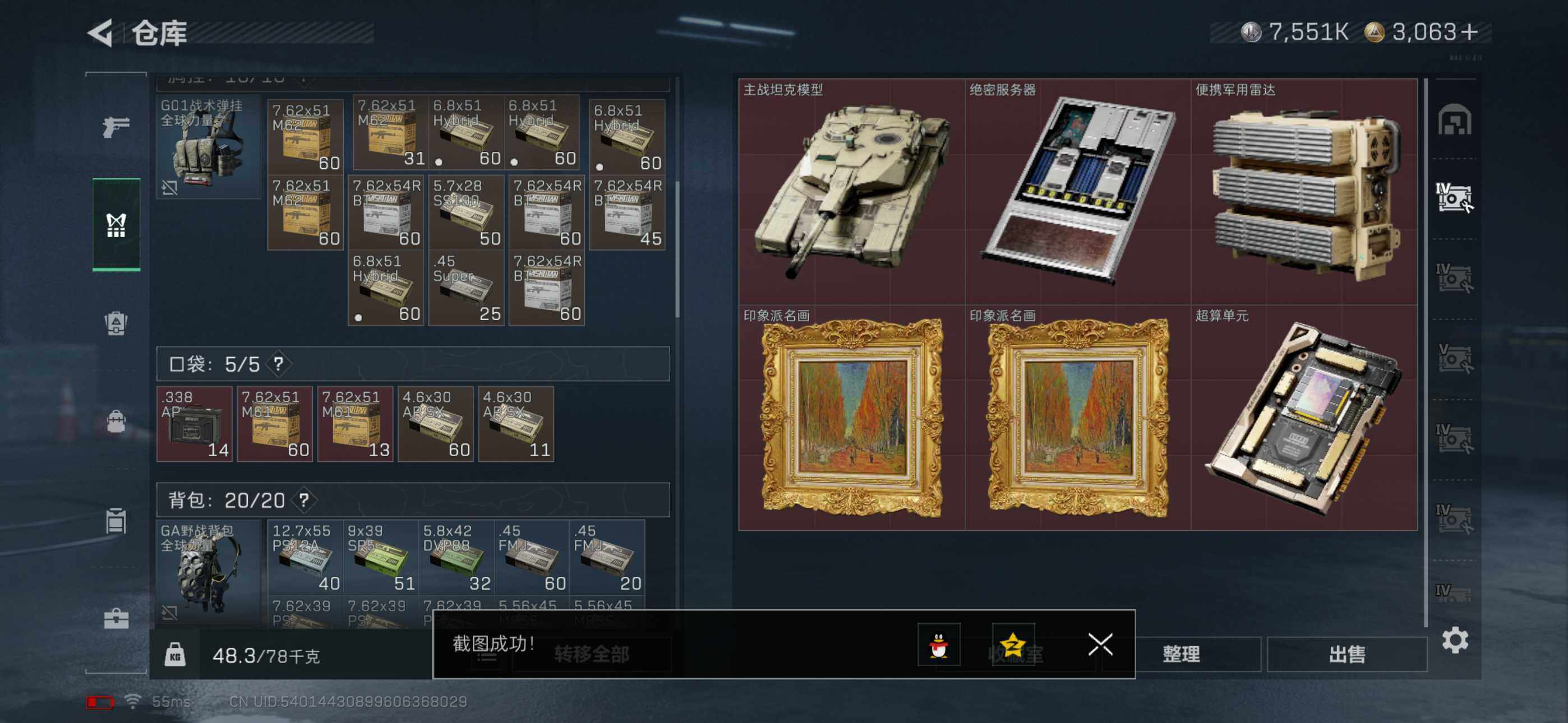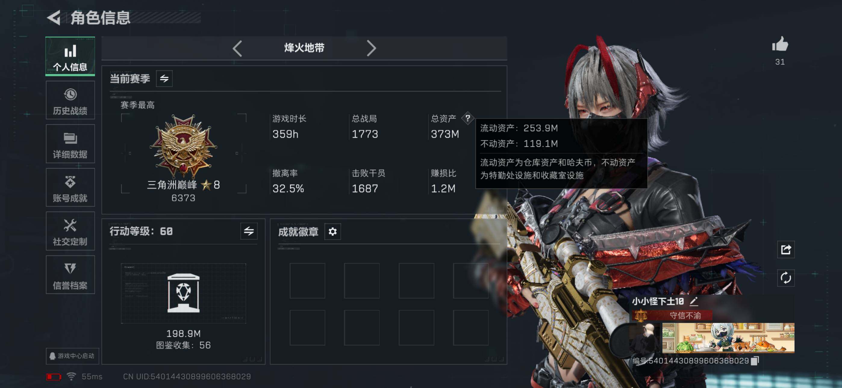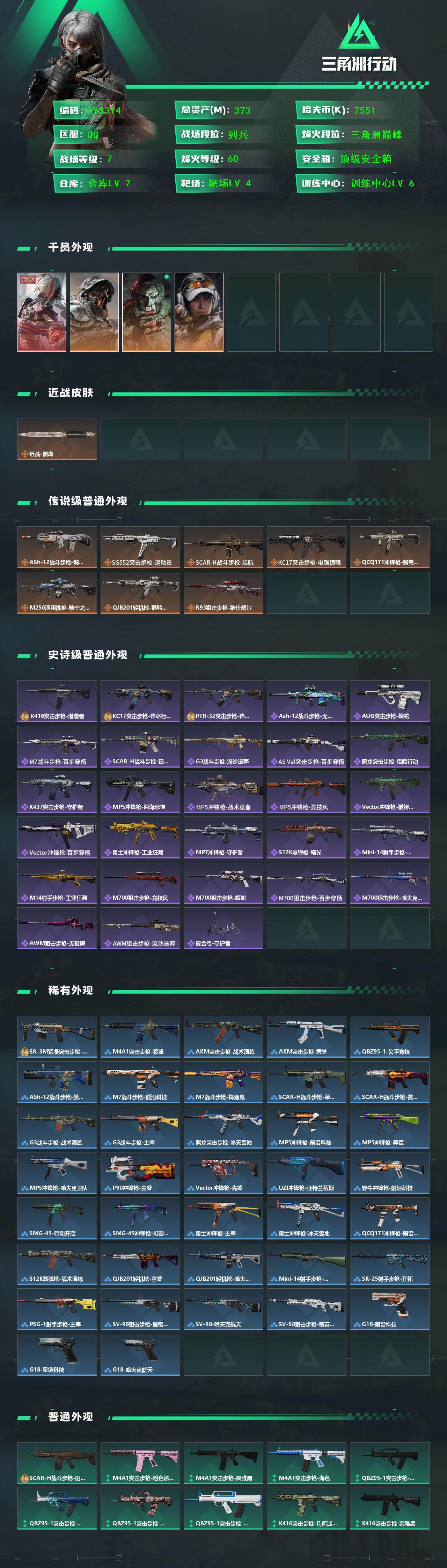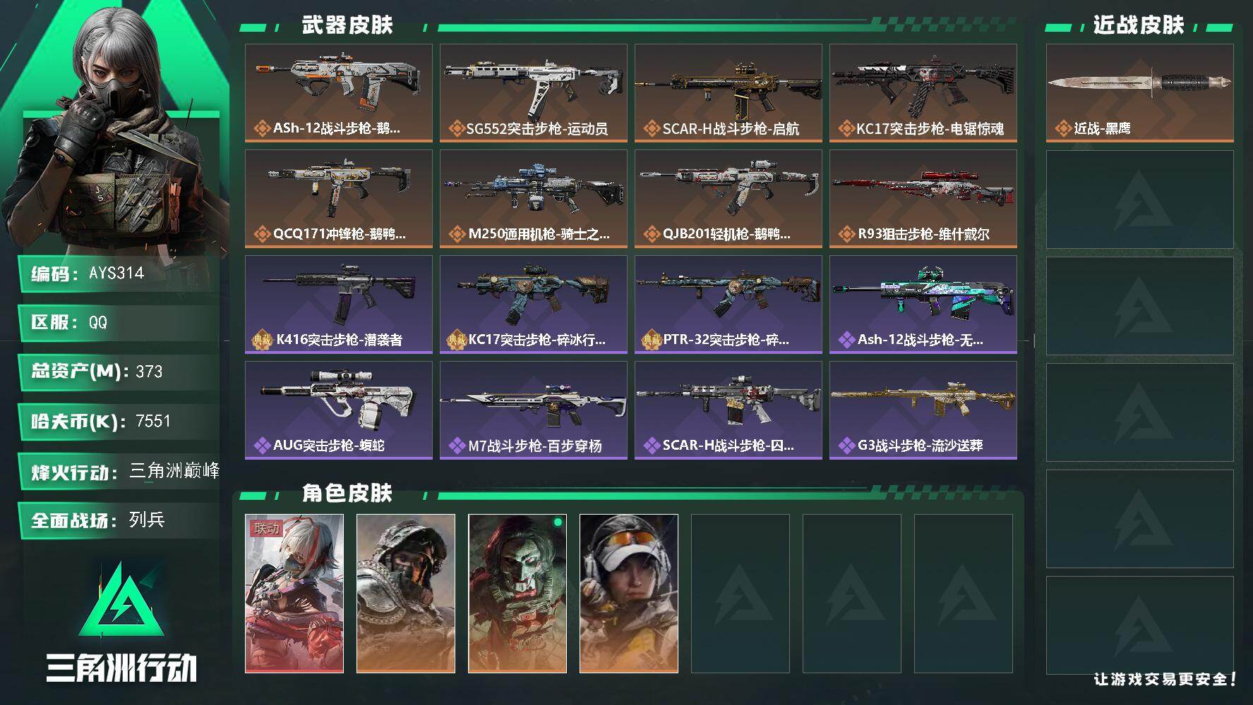 【特价出售/店主推荐】373m总资产-7551k哈伏币-60烽火等级-三角洲巅峰-7战场等级-列兵【干员外观】:骇爪-维什戴尔,深蓝-不破誓约,红狼-电锯惊魂,露娜-金牌射手【近战皮肤】:近战-黑鹰【传说外观】:ASh-12战斗步枪-鹅鸭杀,SG552突击步枪-运动员,SCAR-H战斗步枪-启航,KC17突击步枪-电锯惊魂,QCQ171冲锋枪-鹅鸭杀,M250通用机枪-骑士之心,QJB201轻机枪-鹅鸭杀,R93狙击步枪-维什戴尔【史诗外观】:K416突击步枪-潜袭者,KC17突击步枪-碎冰行动