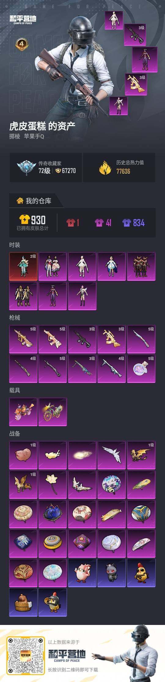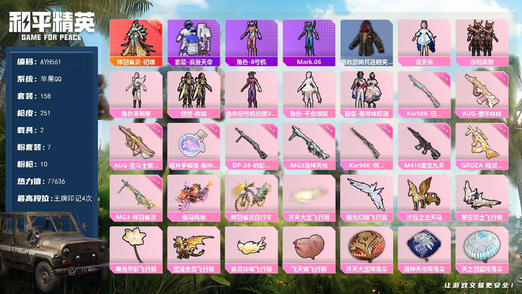1200红装碎片 苹果 手Q-1神装-7粉装-10特效枪-2载具-8粉色飞行器-77636热力值-4王牌印记-158套装-251枪皮