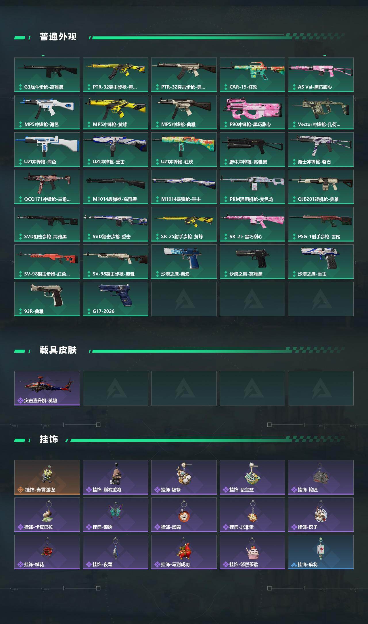 【传说外观】:AKM突击步枪-锦绣,K416突击步枪-行动记录,AUG突击步枪-悠然茶歇,腾龙突击步枪-马年祥瑞,K437突击步枪-锦绣,MK47突击步枪-悠然茶歇,Vector冲锋枪-夜莺,UZI冲锋枪-悠然茶歇,SMG-45冲锋枪-锦绣,MK4冲锋枪-夜莺,Mini-14射手步枪-夜莺,M14射手步枪-蛮荒,M14射手步枪-缄