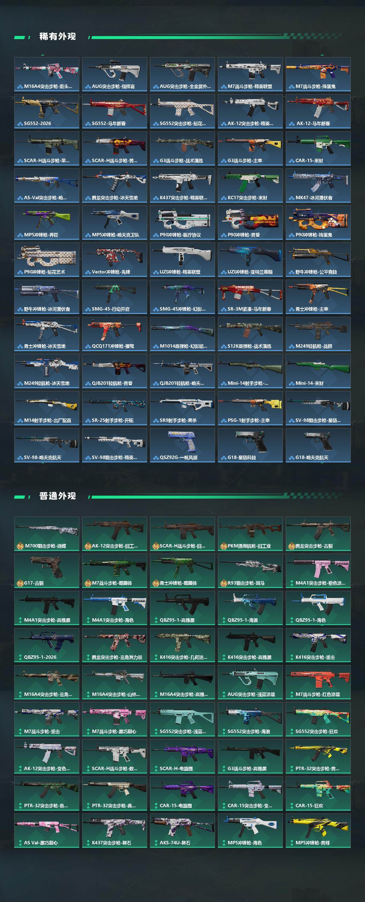 【传说外观】:M4A1突击步枪-阿米娅,AKM突击步枪-锦绣,ASh-12战斗步枪-鹅鸭杀,K416突击步枪-行动记录,M16A4突击步枪-狩猎时刻,SG552突击步枪-运动员,SCAR-H战斗步枪-启航,G3战斗步枪-狩猎时刻,CAR-15突击步枪-阿米娅,腾龙突击
