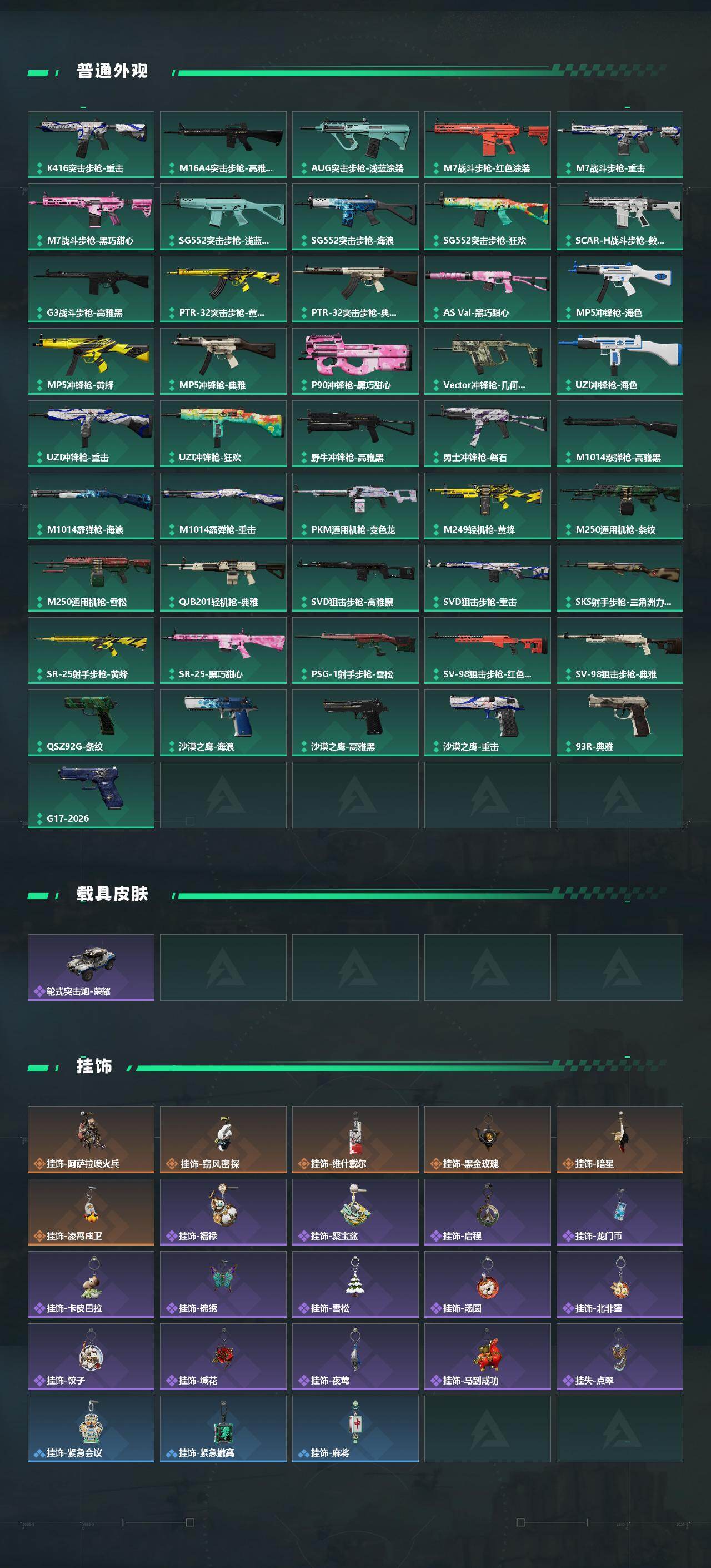【传说外观】:M4A1突击步枪-蚀金玫瑰,M4A1突击步枪-阿米娅,AKM突击步枪-锦绣,QBZ95-1突击步枪-凌霄戍卫,SG552突击步枪-点翠,SCAR-H战斗步枪-启航,G3战斗步枪-骑士,CAR-15突击步枪-阿米娅,腾龙突击步枪-马年祥瑞,K437突击步枪-锦绣,KC17突击步枪-电锯惊魂,KC1