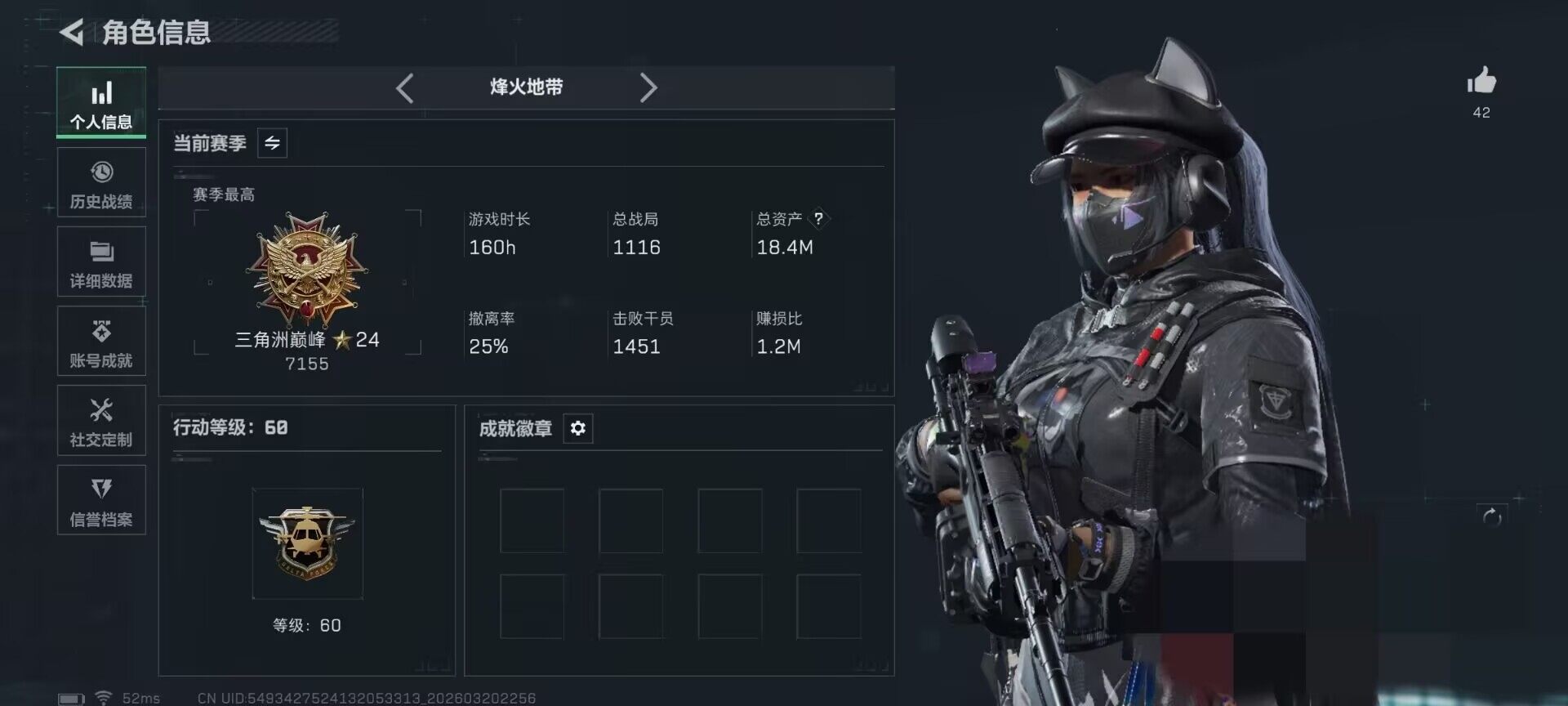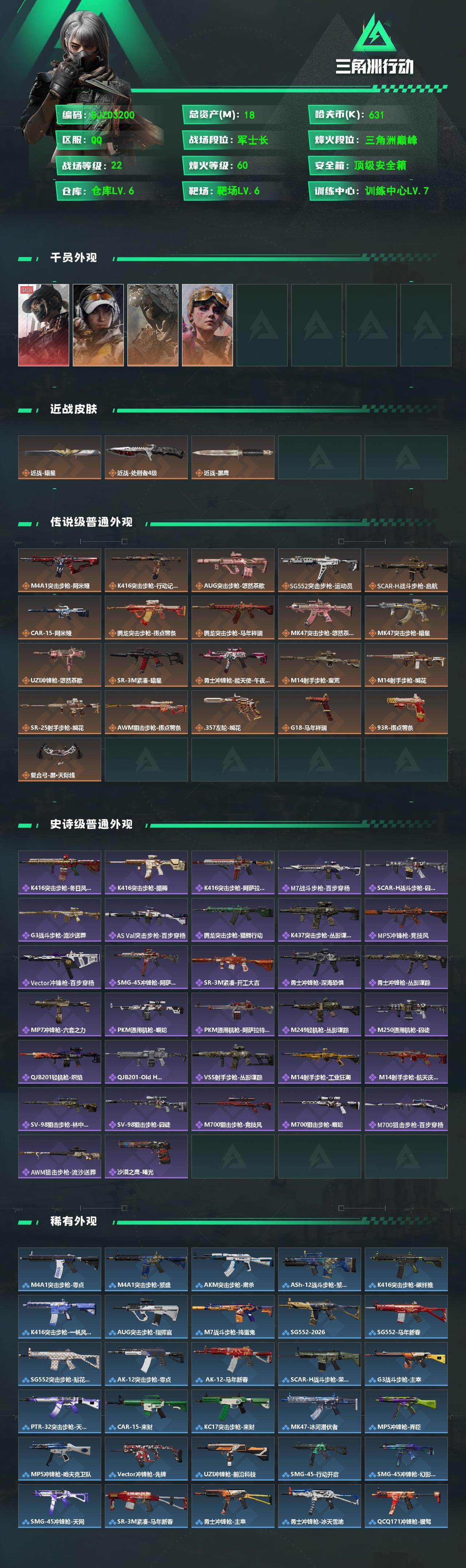 18m总资产-631k哈夫币-60烽火等级-三角洲巅峰-22战场等级-军士长