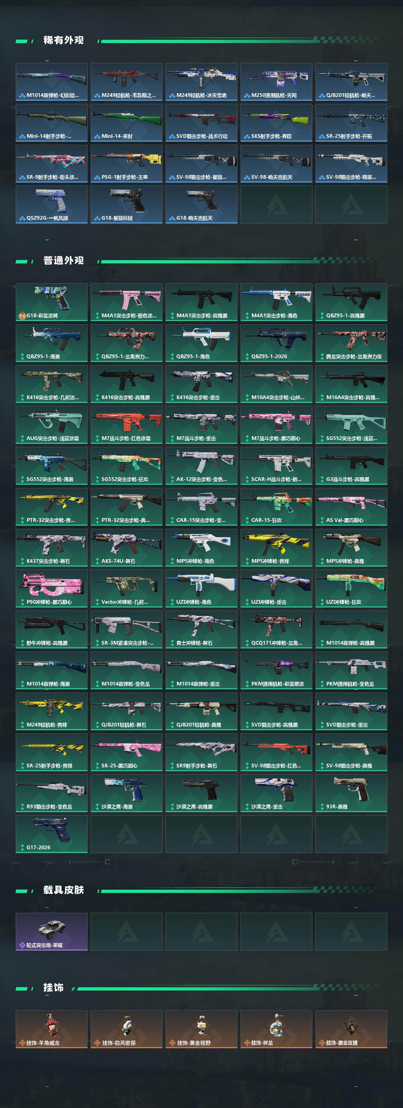 【传说外观】:M4A1突击步枪-阿米娅,K416突击步枪-行动记录,AUG突击步枪-悠然茶歇,SG552突击步枪-运动员,SCAR-H战斗步枪-启航,CAR-15突击步枪-阿米娅,腾龙突击步枪-捞点薯条,腾龙突击步枪-马年祥瑞,MK47突击步枪-悠然茶歇,MK47突击步枪-暗星,UZI